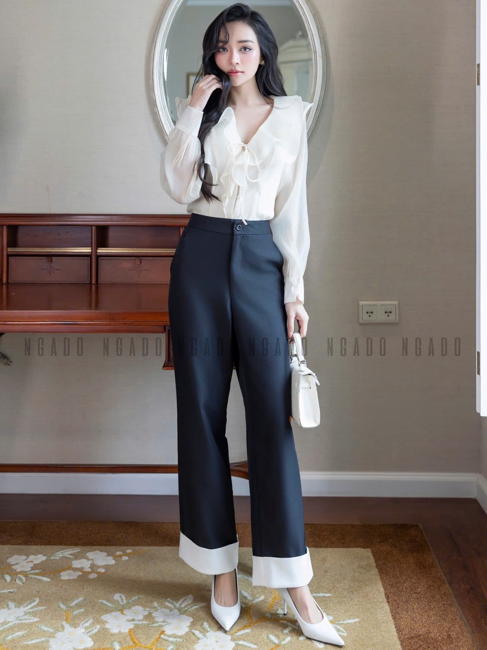 ✨Quần đen phối trắng NGADO, Quần tây nữ, Quần công sở, Quần ống đứng, ống rộng