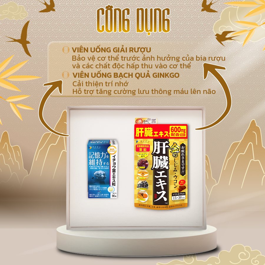 Combo FUJI Tết An Khang  - Viên uống giải rượu Fine Japan tăng cường chức năng gan 90 viên - Viên Uống Bạch Quả Ginkgo Fine Japan Hỗ Trợ Chức Năng Não Hộp 18g (90