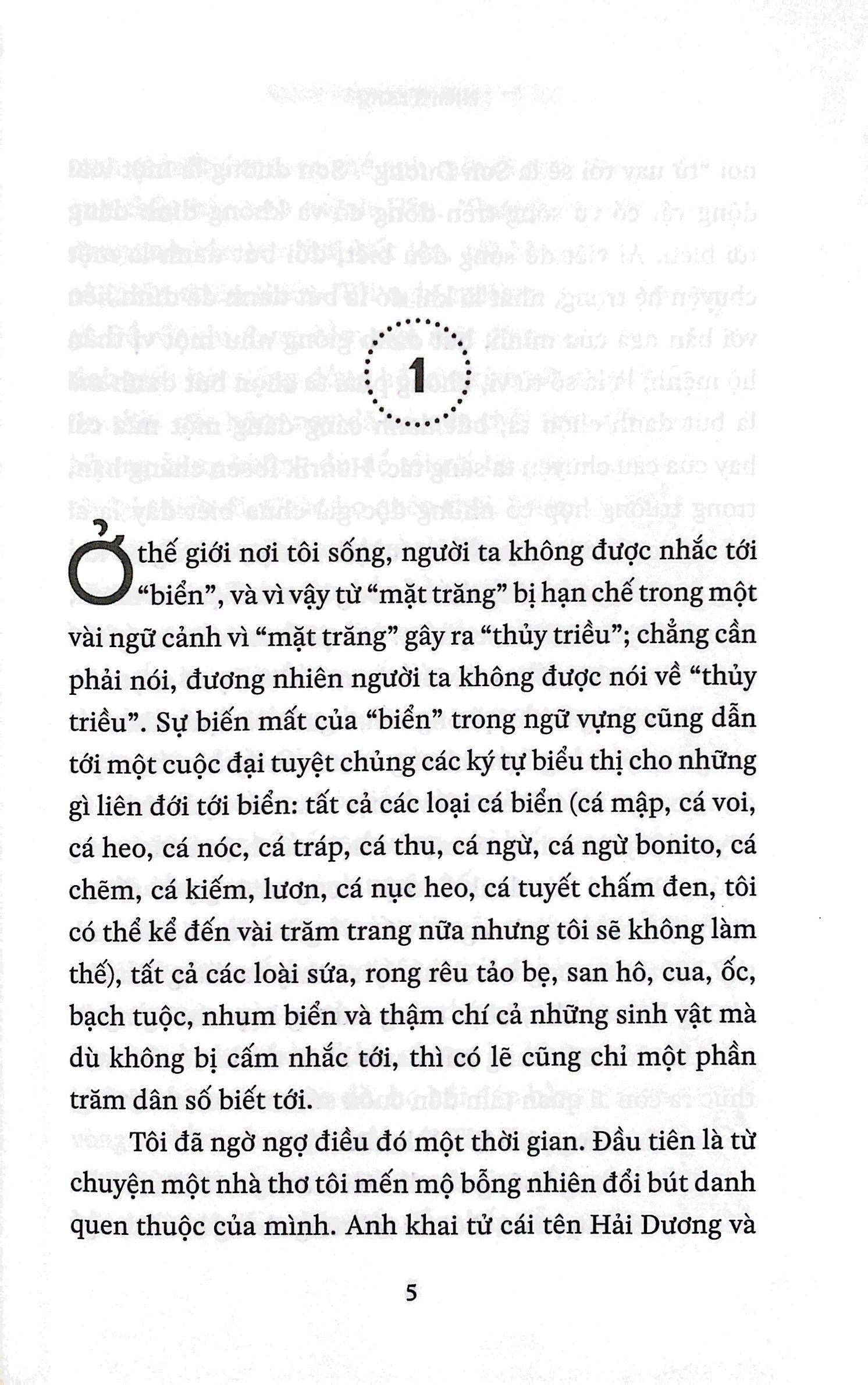 Sau khi bị nhà xuất bản từ chối bản thảo tiểu thuyết mới nhất, một nhà văn nhận ra rằng, trong thế giới cô đang sống, người ta không được quyền nhắc tới "biển". Cô tìm mọi cách để xuất bản cuốn sách của m.ình, và rồi hành trình kỳ lạ mở ra, dẫn cô tới một thư viện nơi những hồn ma thủ thư còn sống mãi, một quán bar như lọt thỏm trong chốn phi-thời-gian, một nhà xuất bản hoạt động trong thế giới ngầm, và những nhà văn không ai rõ danh tính.