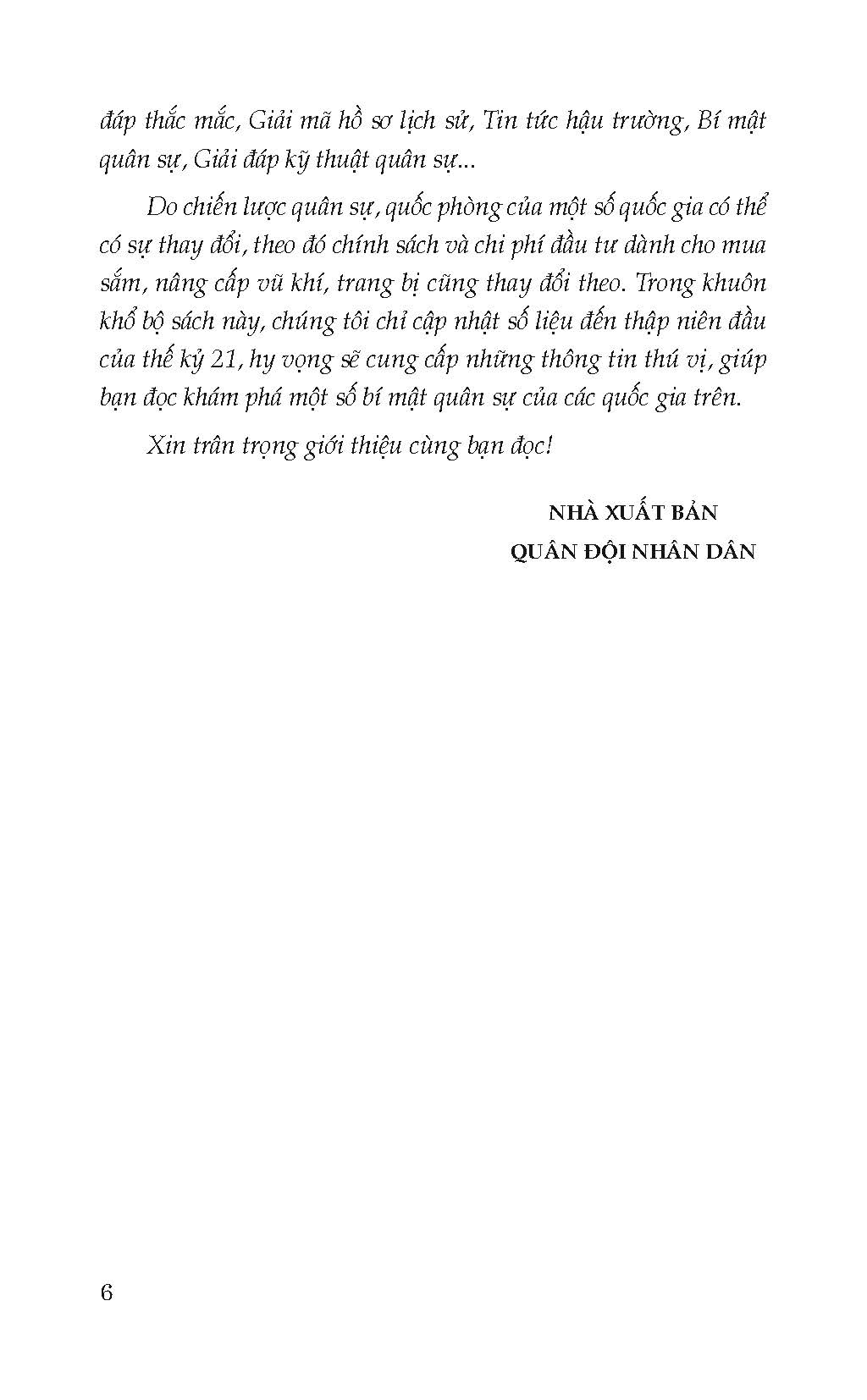 Thế giới đang trong thời kỳ thái bình thịnh trị, nhưng đâu đó trên trái đất này, những cuộc xung đột khu vực, can thiệp vũ trang vẫn liên tiếp xảy ra, đặc biệt ý đồ tranh giành ngôi vị bá chủ toàn cầu và các hành động quân sự của các cường quốc quân sự vẫn tiếp diễn. Vì vậy, việc tìm hiểu thực lực quân sự của các quốc gia trên thế giới là việc hết sức cần thiết, giúp tạo niềm đam mê tìm hiểu về lĩnh vực quân sự cho các bạn trẻ, đồng thời giúp họ có ý thức về chiến tranh, quan niệm về chiến tranh và quan niệm về quốc phòng an ninh trong thời đại mới. Từ đó giúp các bạn trẻ có suy ngẫm toàn diện về lợi ích, trách nhiệm và sứ mệnh của quốc gia, dân tộc và bản thân.