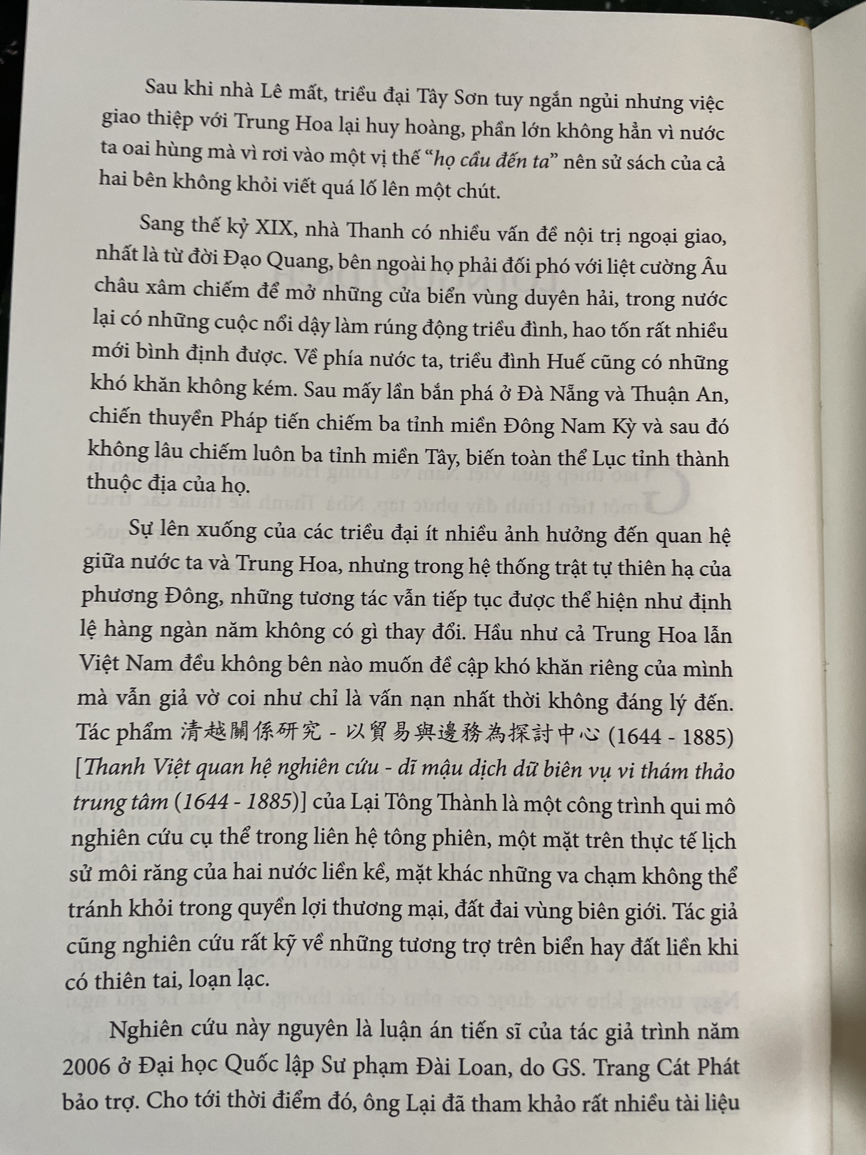 Sự lên xuống của các triều đại ít nhiều ảnh hưởng đến quan hệ giữa nước ta và Trung Hoa, nhưng trong hệ thống trật tự thiên hạ của phương Đông, những tương tác vẫn tiếp tục được thể hiện như định lệ hàng ngàn năm không có gì thay đổi. Hầu như cả Trung Hoa lẫn Việt Nam đều không bên nào muốn đề cập khó khăn riêng của mình mà vẫn giả vờ coi như chỉ là vấn nạn nhất thời không đáng lý đến. Tác phẩm (1644-1885) [Thanh Việt quan hệ nghiên cứu - dĩ mậu dịch dữ biên vụ vi thám thảo trung tâm (1644 - 1885)] của Lại Tông Thành là một công trình qui mô nghiên cứu cụ thể trong liên hệ tông phiên, một mặt trên thực tế lịch sử môi răng của hai nước liền kề, mặt khác những va chạm không thể tránh khỏi trong quyền lợi thương mại, đất đai vùng biên giới. Tác giả cũng nghiên cứu rất kỹ về những tương trợ trên biển hay đất liền khi có thiên tai, loạn lạc.