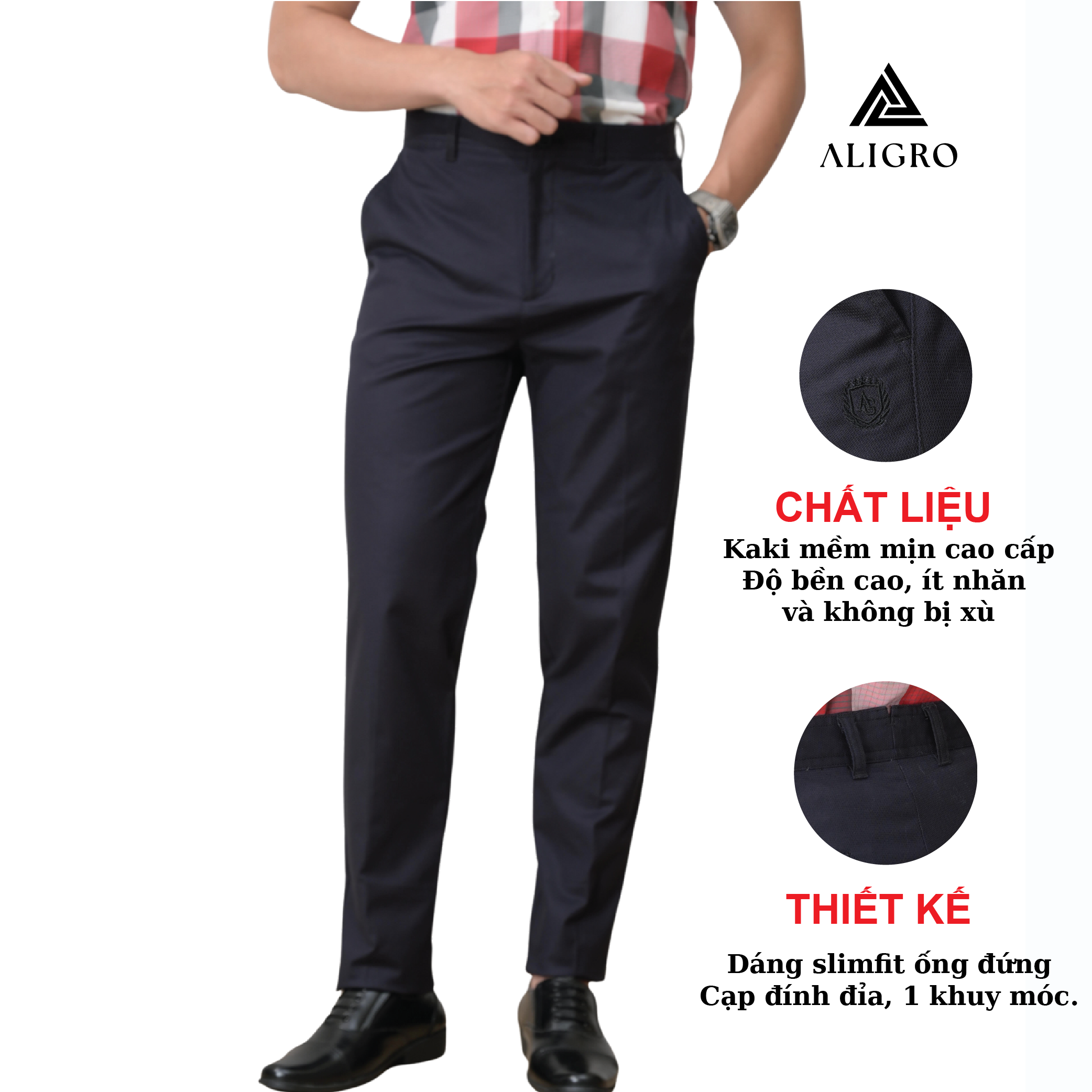 Mua tại TiktokGIỚI THIỆU THƯƠNG HIỆU Mang trong mình tầm nhìn chiến lược trở thành thương hiệu “Thời trang nam được yêu thích nhất Việt Nam” nên Aligro luôn chú trọng nghiên cứu phát triển mẫu mã, phom dáng phù hợp với vóc dáng hình thể đàn ông Việt. Sản phẩm của chúng tôi mang tới hình ảnh trẻ trung, năng động, hiện đại mà không kém phần lịch sự, sang trọng - cam kết mang lại giá trị đích thực và một cuộc sống thịnh vượng hơn cho phái mạnh Việt. CHI TIẾT THIẾT KẾ QUẦN KAKI NAM ALIGRO