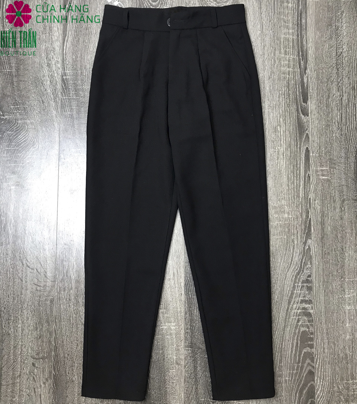 CHẤT LIỆU KAKI TÂY, DÀY DẶN ĐỨNG FORM QUẦN MÀU ĐEN FORM QUẦN ỐNG ĐỨNG, SUÔN THẲNG TẠO ĐÔI CHÂN DÀI PHẦN LAI QUẦN XẺ HAI BÊN TAG LOGO GẮN NGAY SƯỜN TÚI VÒNG EO
