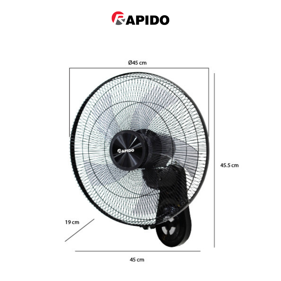 Với thiết kế treo tường màu đen sang trọng, quạt treo tường Rapido tạo thẩm mỹ tinh tế, phù hợp với không gian nhà ở, quán cà phê, nhà hàng