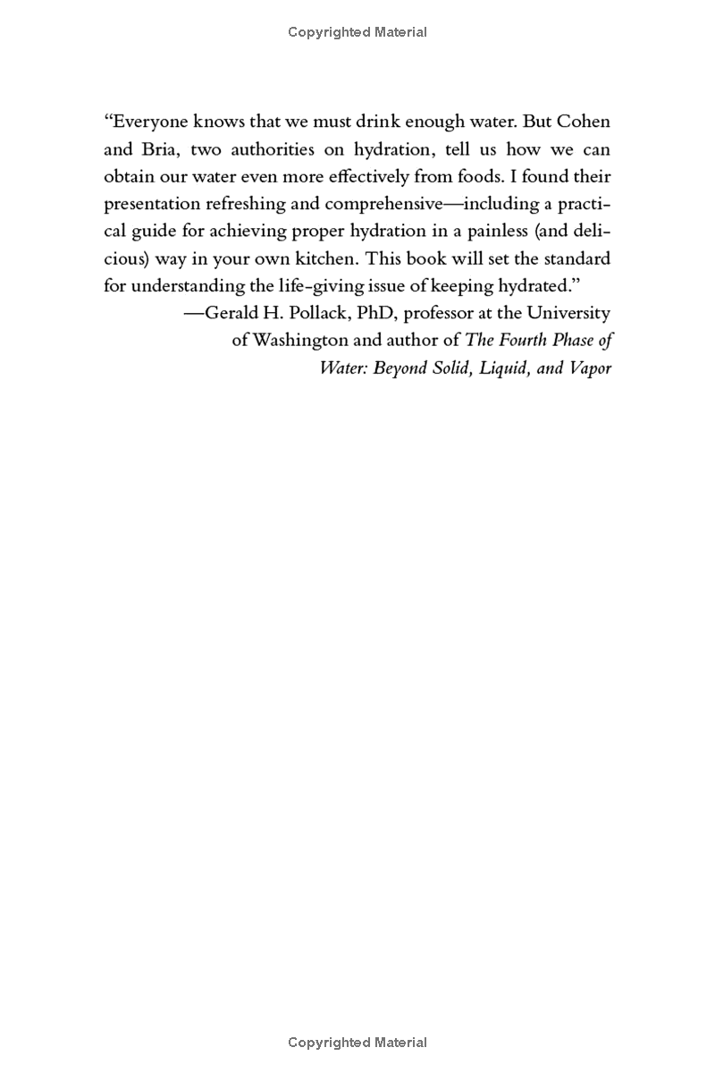 Quench presents a wellness routine that can reverse all of that, based on breakthrough new science in the field of hydration. Readers will be surprised to learn that drinking too much water can flush out vital nutrients and electrolytes. Here is where "gel water" comes in: the water from plants (like cucumber, berries, aloe), which our bodies are designed to truly absorb right down to the cellular level. In fact, Ms. Bria's work as an anthropologist led her to the realization that desert people stay hydrated almost exclusively from what they eat, including gel plants like cactus.