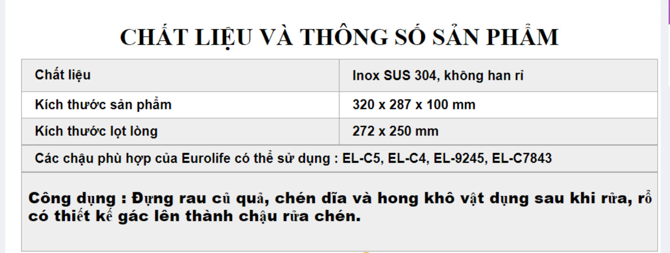 - Rổ có thể kết hợp vừa vặn với rất nhiều mẫu chậu rửa chén của Eurolife (tham khảo hình ảnh)