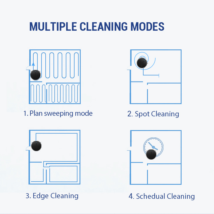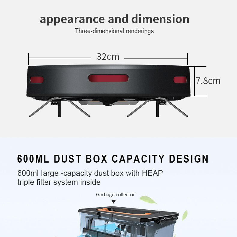 Điều hướng thông minh: Chế độ điều hướng con quay hồi chuyển, nhanh hơn gấp 3 lần so với các robot điều hướng ngẫu nhiên hàng đầu Đường dọn vệ sinh: có bàn chải chính
