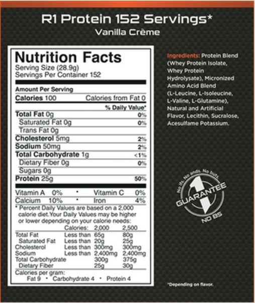 - Rule 1 Whey protein isolate chứa 25 gam mỗi khẩu phần, với 100% whey cô lập , whey thủy phân hiệu quả nhanh, hơn 6 gam BCAAs và hầu như không có gì khác.
