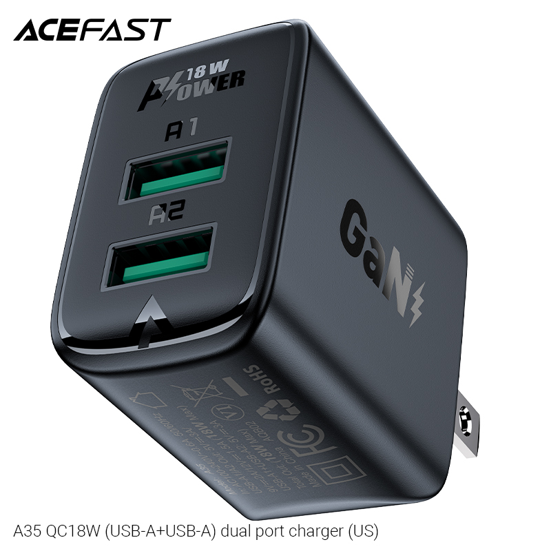 Mua tại TiktokSạc ACEFAST A35, 2 cổng USB-A QC18W, phích cắm US, hỗ trợ hầu hết các giao thức sạc nhanh. Thông số kỹ thuật: