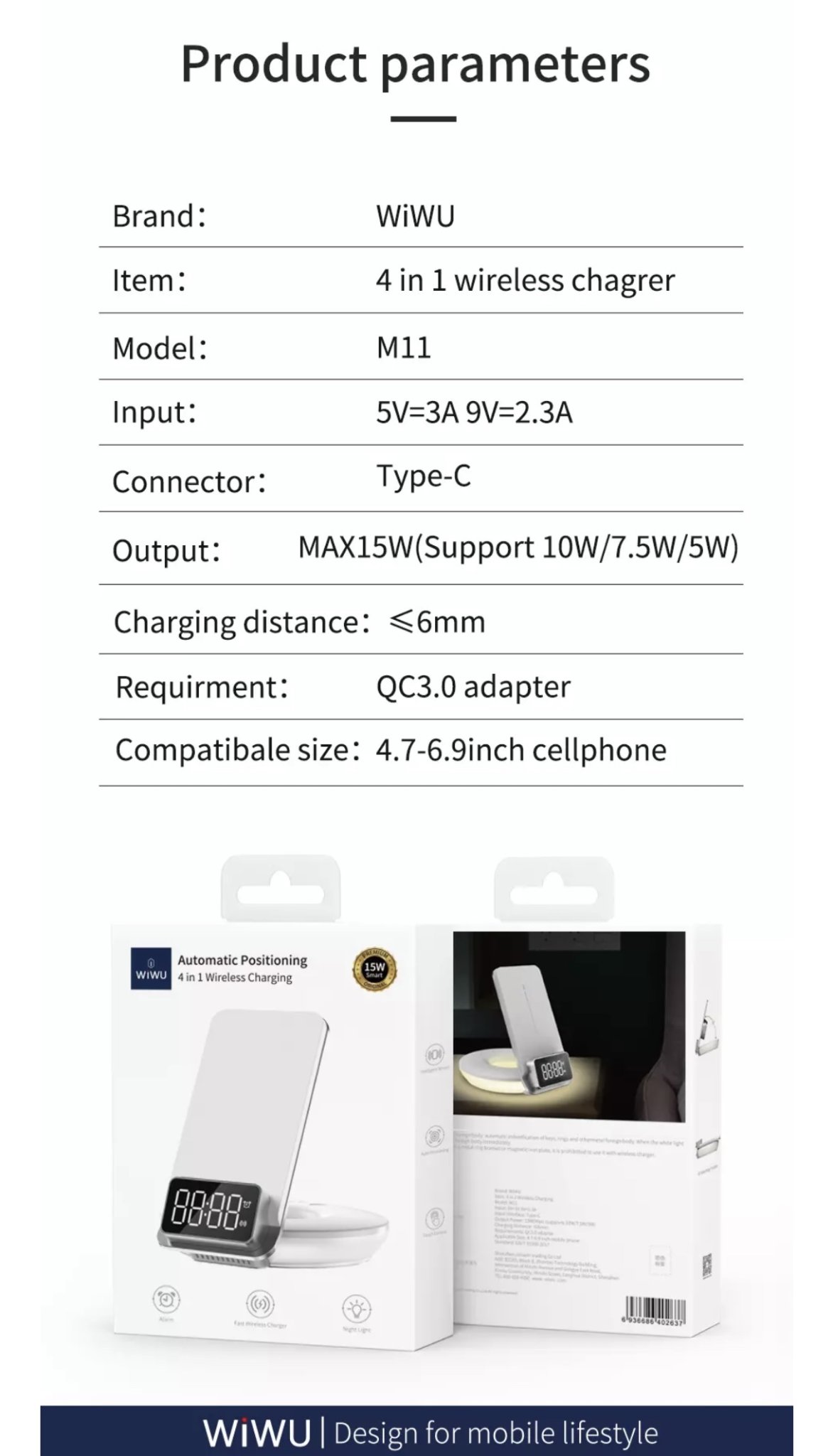 Mua tại TiktokSạc Wiwu Automatic Positioning 4 in 1 M11 Thương hiệu: Wiwu Mô tả sản phẩm - Chất liệu: hợp kim nhôm chất lượng cao và bền - Bộ sạc không dây 4 in 1 và là giá đỡ để bàn cho điện thoại - Hỗ trợ sạc không dây nhanh - Cuộn dây có thể tháo rời, ngang và dọc - Định vị chính xác - Sạc có chế độ đèn ban đêm ánh sáng dịu nhẹ và thoải mái - Xung quanh sạc ánh sáng ấm áp và sáng sủa - Điều chỉnh đa hướng sử dụng trong nhiều tình huống - Sạc có đồng hồ hiển thị giờ - Hỗ trợ cho tất cả các máy có chế độ sạc không dây. Bộ chuyển đổi dành cho di động 4.7- 6.9inch - Đầu ra: 5V = 3A 9V = 2.3A - Giao diện: loại C - Tỉ lệ đầu ra: 15W ( hỗ trợ 10W/7,5W,5W)