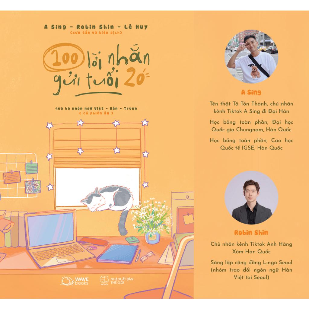 Giới thiệu sách: 100 LỜI NHẮN GỬI TUỔI 20 100 lời nhắn gửi tuổi 20 là cuốn sách tam ngữ Việt - Hàn - Trung, do ba tác giả trẻ tài năng A Síng, Robin Shin và Lê Huy sưu tầm, biên soạn dành tặng riêng cho các bạn ở độ tuổi đôi mươi. Tuổi 20 là độ tuổi đẹp nhất trong quãng thời gian thanh xuân, khi cõi lòng luôn hừng hực những hoài bão, nhiệt huyết chinh phục thế giới, mở mang tri thức và sống một tuổi trẻ rực cháy. Tuổi 20 trọn vẹn cũng không thể thiếu những mông lung, chông chênh và âu lo vì chưa thể xác định mình là ai trong cuộc sống này. Đôi khi những khó khăn khiến bạn nản lòng, gục ngã và muốn bỏ cuộc để mặc ngày tháng trôi đi. Nhưng bạn ơi, bạn chỉ có một lần để sống và tuổi đôi mươi cũng chỉ được đếm một lần. Bỏ phí như vậy liệu bạn có hối hận không? 100 lời nhắn gửi tuổi 20 với 100 thông điệp tiếp thêm động lực để bạn vượt qua những chướng ngại đồng thời tận hưởng trọn vẹn niềm vui của ngày tháng tuổi trẻ. Mong bạn sẽ sống tuổi 20 thật rực rỡ để khi 30, 40 tuổi nhìn lại, bạn sẽ không phải nói hai từ “giá như”. Sách được phát hành bởi Wavebooks - thương hiệu sách dành cho người Việt trẻ. Về tác giả: Tác giả A Síng (Tô Tôn Thành) phụ trách nội dung tiếng Việt - Hàn, là chủ nhân kênh TikTok A Síng đi Đại Hàn với hơn 264 ngàn follower. Anh là cựu học sinh Trường THPT Chuyên Lê Hồng Phong và là cựu sinh viên Trường Đại Học Bách Khoa - ĐHQG TP HCM. Ngoài việc học trong nước, anh cũng liên tiếp nhận hai Học bổng toàn phần của Đại học Quốc gia Chungnam và Cao học Quốc tế IGSE, Hàn Quốc. Tác giả Robin Shin, phụ trách nội dung tiếng Hàn, sở hữu kênh TikTok Anh Hàng Xóm Hàn Quốc làm mưa làm gió trên mạng xã hội với hơn 373 ngàn người theo dõi. Anh là người sáng lập cộng đồng Lingo Seoul (nhóm trao đổi ngôn ngữ Hàn Việt tại Seoul). Qua kênh TikTok, có thể thấy Robin Shin là một người hài hước, sống tích cực và lạc quan. Tác giả Lê Huy, phụ trách nội dung tiếng Trung, là thủ khoa sự phạm tiếng Trung, ĐH Sư Phạm . Ngoài ra, anh cũng nhận được Học bổng toàn phần của Đại học Ngôn ngữ và Văn hóa Bắc Kinh.