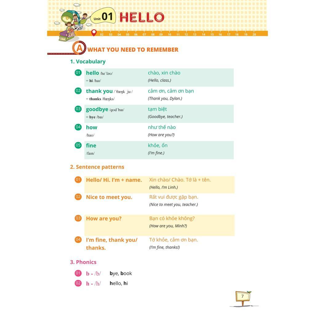 - Cấu trúc bài học chặt chẽ – Ôn tập toàn diện, ghi nhớ nhanh A. Kiến thức cần nhớ – What you need to remember Phần lý thuyết ngắn gọn, giúp các em ôn tập toàn bộ kiến thức từ vựng, cấu trúc và ngữ âm theo mỗi unit trên lớp B. Bài kiểm tra tổng hợp – Let’s put your memory to the test Bài kiểm tra tổng hợp các dạng bài tập thực hành: Trắc nghiệm chọn câu đúng, nghe và điền từ, tìm lỗi sai, nối, hoàn thành câu… C. Đáp án – Answer key Đáp án và lời giải chi tiết cuối sách giúp các em tự đánh giá lại mức độ thông hiểu và ghi nhớ, khắc sâu thêm kiến thức