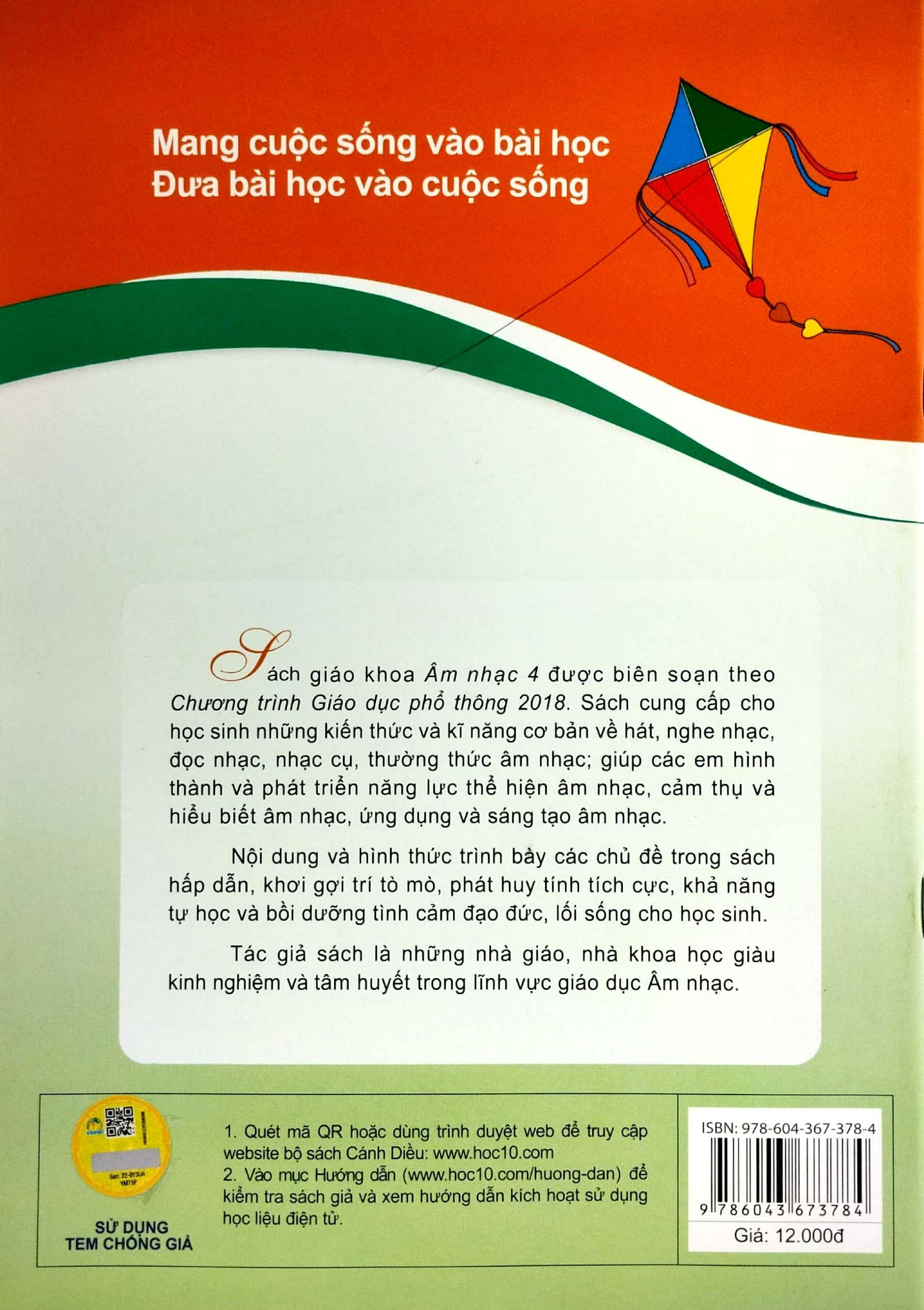 Sách giáo khoa Âm Nhạc 4 thuộc bộ sách Cánh Diều, được biên soạn dựa trên quan điểm, mục tiêu của Chương trình Giáo dục phổ thông 2018 nhằm đáp ứng yêu cầu phát triển phẩm chất và năng lực học sinh.