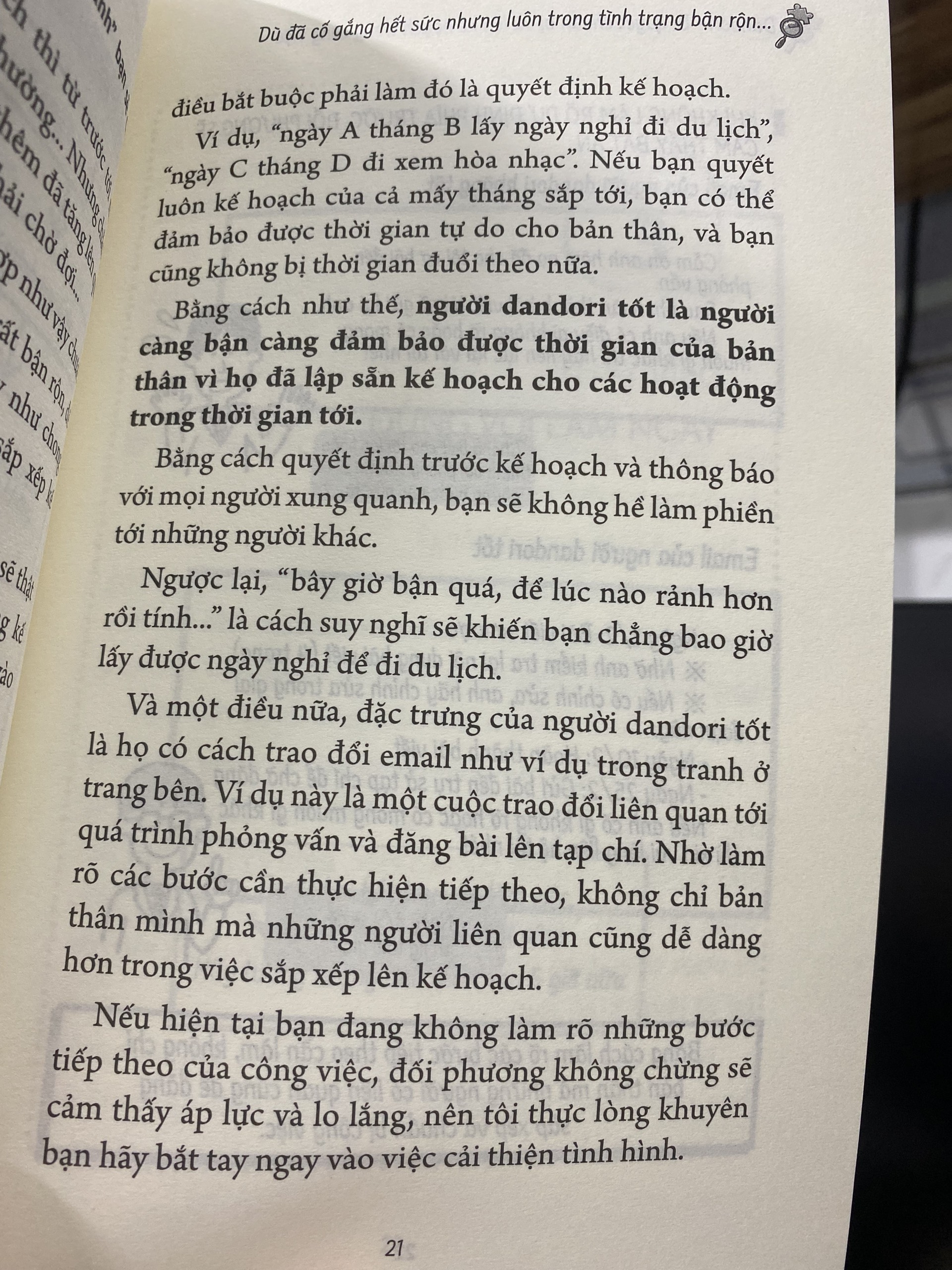 Ở Nhật, Dandori đã trở thành một từ phổ biến, người ta thường nghe “người này Dandori tốt” “người kia Dandori kém”. Vậy Dandori là gì? Có thể hiểu Dandori là năng lực chuẩn bị và sắp xếp công việc. Người có khả năng Dandori tốt không phải là người xử lý công việc nhanh, có thao tác khéo léo mà là người biết mục đích thực sự của việc mình sẽ làm và để đạt được mục đích đó phải lập kế hoạch chi tiết cũng theo nhiều phương án cụ thể, để dù có xảy ra bất cứ tình huống nào mục tiêu vẫn được thực hiện.