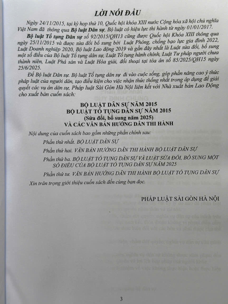 Nhằm phổ biến đến Quý Cơ quan, Đơn vị và Quý khách hàng thân thiết nắm bắt kịp thời những quy định pháp luật mới nêu trên. Nhà sách Nam Việt xin trân trọng giới thiệu cuốn sách: Bộ Luật Dân Sự năm 2015, Bộ Luật Tố Tụng Dân Sự năm 2015 sửa đổi, bổ sung năm 2025 và Các Văn Bản Hướng Dẫn Thi Hành
