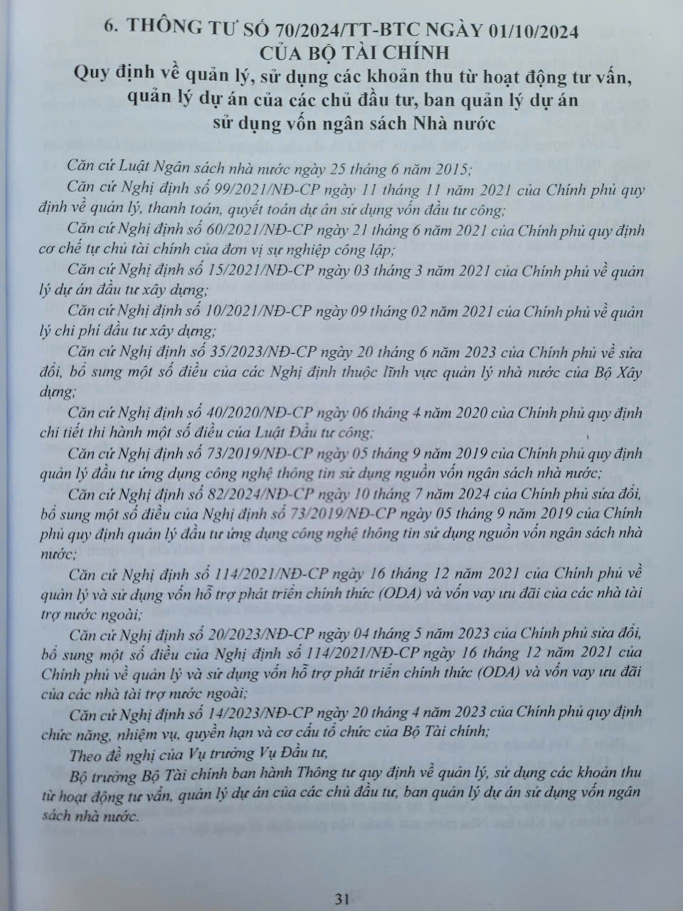 – Thông tư số 70/2024/TT-BTC ngày 01/10/2024 Quy định về quản lý, sử dụng các khoản thu từ hoạt động tư vấn, quản lý dự án của các chủ đầu tư, ban quản lý dự án sử dụng vốn ngân sách Nhà nước;