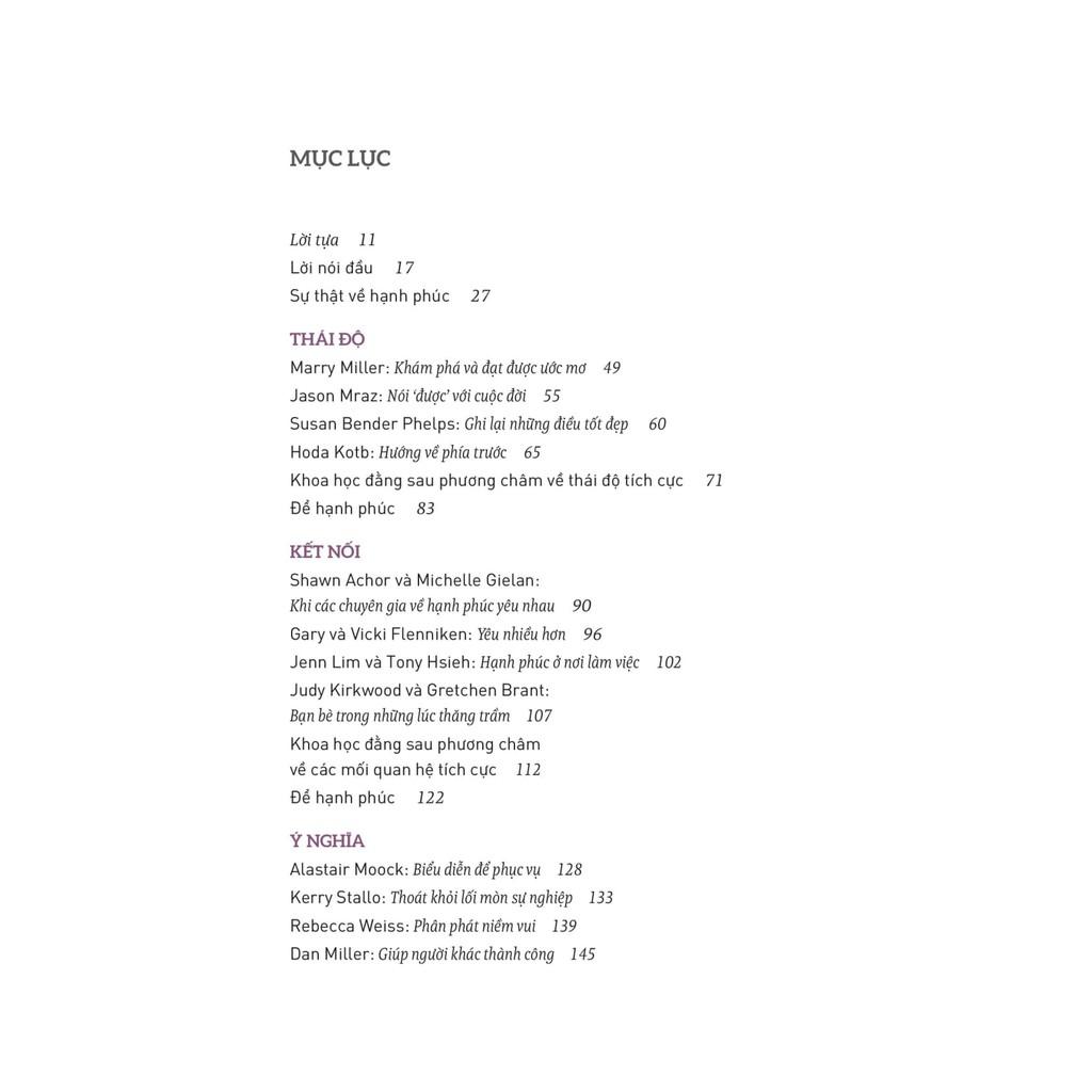 Bố cục thành mười yếu tố của một cuộc đời hạnh phúc, từ lòng biết ơn đến thái độ và sống có mục đích, Chọn sống hạnh phúc tập hợp những câu chuyện hạnh phúc đời thực tỏa sáng, những ví dụ mở mắt về khoa học hạnh phúc, và những “hành động hạnh phúc” đơn giản và cảm hứng mỗi ngày để đạt những đột phá hạnh phúc lớn lao.