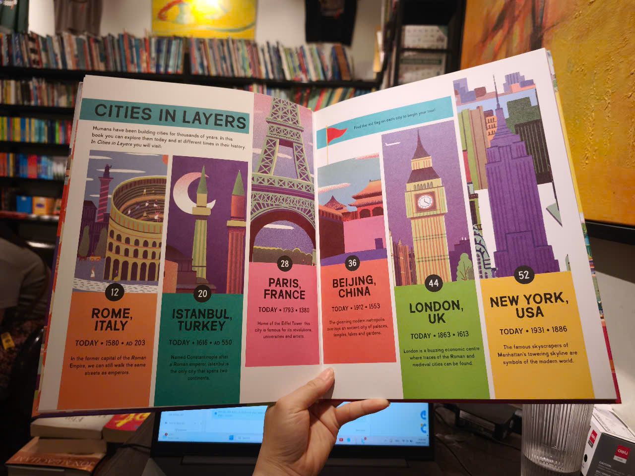 Trong Cities in Layers, sáu thành phố nổi tiếng trên thế giới sẽ được trình chiếu ở các giai đoạn lịch sử khác nhau của chúng. Một yếu tố cắt ghép thông minh cho phép người đọc thực sự cảm thấy như họ đang quay ngược thời gian.