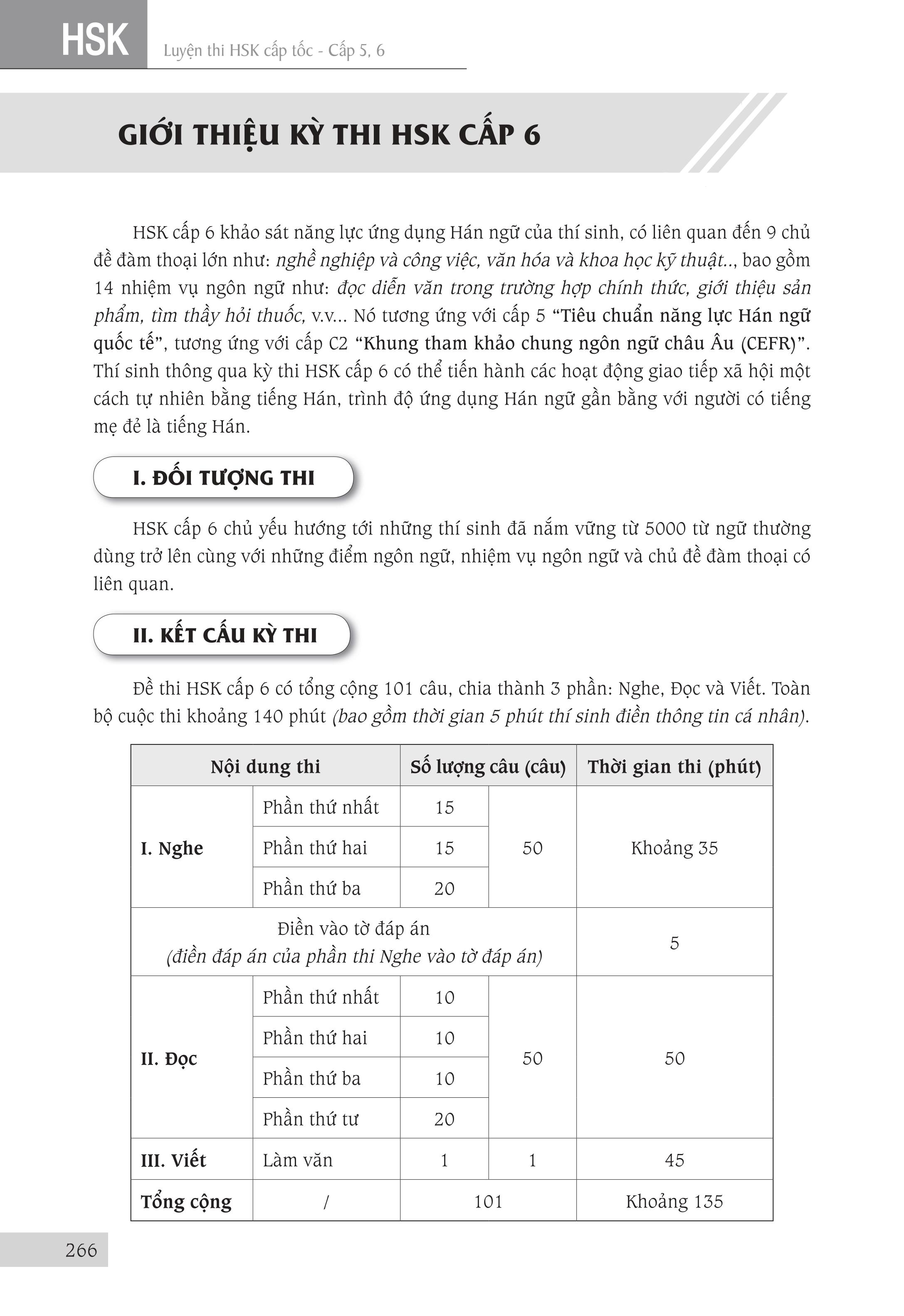 - Luyện thi HSK cấp tốc tập 3 - Cấp 5-6 (kèm CD) Tác giả: Trương Văn GIới & Lê Khắc Kiều Lục Nhà xuất bản Đại Học Quốc Gia TPHCM Số trang: 568 Kích thước: 18.5cm x 26.5cm x 2.7cm Cân nặng: 900g Đầu tiên xin được thuyết minh về chữ “cấp tốc” mà chúng tôi dùng trong tên của bộ sách. “Cấp tốc” không phải theo ý nghĩa đơn giản là nhanh và dễ dàng, không cần phải học nhiều mà cũng có thể thi đậu. Ý nghĩa của từ “Cấp tốc” mà chúng tôi hướng đến khi biên soạn bộ sách này là giúp người học nắm vững toàn bộ kiến thức của kỳ thi của một cách nhanh nhất mà vẫn bảo đảm kết quả tốt nhất. Người học vẫn phải làm việc cật lực để chuẩn bị tốt cho kỳ thi mới hy vọng có được kết quả khả quan. Kỳ thi HSK do Văn phòng Hán ngữ nhà nước Trung Quốc (gọi tắt là HANBAN) tổ chức. HANBAN đã xây dựng chuẩn kiến thức (từ vựng, điểm ngôn ngữ, chủ đề đàm thoại …) cho từng cấp độ, từ đó đưa ra đề thi mẫu tương ứng cho cấp độ thi đó. Như vậy, Đề cương và Đề thi mẫu của HANBAN chính là tài liệu chuẩn để thí sinh ôn luyện, giáo viên và các trường giảng dạy cho kỳ thi HSK. Nó cũng là đề cương để các tác giả, nhà xuất bản và các đơn vị biên soạn và xuất bản các tài liệu cho kỳ thi này. Để đạt mục tiêu “cấp tốc” đã giải thích ở trên, chúng tôi dựa vào Đề cương và Đề thi mẫu của HANBAN, cũng như những tài liệu luyện thi HSK của Trung Quốc để biên soạn bộ sách này. Từng phần của bài thi được giới thiệu qua một cấu trúc thống nhất như sau: I. Đặc điểm dạng đề: Phần này giới thiệu cấu trúc, đặc điểm và cách làm dạng bài thi này. Ở đề thi viết còn giới thiệu cách chấm điểm của dạng đề. Rõ ràng là để làm bài thi tốt, đầu tiên là phải nắm vững đề thi và biết cách làm loại đề thi đó. II. Những lỗi thường gặp: Chúng tôi tổng hợp những lỗi thường gặp của thí sinh khi làm dạng đề thi này. Học tập từ sai lầm là cách cực kỳ hiệu quả để tránh lặp lại những sai lầm của những người đi trước đã gặp phải khi làm bài. III. Trọng điểm thi, cách thức và kỹ xảo làm bài: Đây là phần quan trọng nhất của tài liệu Phần trọng điểm thi giới thiệu những trọng tâm mà dạng đề thi tập trung vào. Liên quan đến trọng điểm thi này, chúng tôi đã hệ thống hóa các điểm ngôn ngữ, công thức hóa các cấu trúc ngữ pháp cũng như tập hợp các từ ngữ có liên quan. Tiếp theo, người học sẽ được giới thiệu về cách thức, kỹ xảo làm bài. Cuối cùng là Mục phân tích ví dụ, Phần này được chúng tôi biên soạn hết sức công phu vì biết rằng những lý thuyết, những phân tích ở phần trọng điểm thi, cách thức kỹ xảo làm bài sẽ rất khó được nắm bắt nếu không có những ví dụ cụ thể. Những ví dụ được sử dụng được lấy từ các đề thi, ưu tiên lấy từ đề thi mẫu của HANBAN, để minh họa cho những vấn đề đã được giới thiệu ở phần trọng điểm thi và cách thức kỹ xảo làm bài.