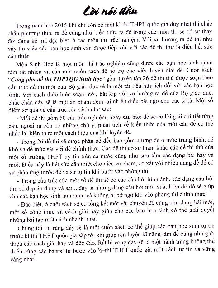 Môn Sinh Học là một môn thi trắc nghiệm cũng được các bạn học sinh quan tâm rất nhiều và cần một cuốn sách để hỗ trợ cho việc luyện giải đề. Cuốn   “Công phá đề thi THPTQG Sinh học” gồm tuyển tập 26 đề thi thử được soạn theo cấu trúc đề thi mới của Bộ giáo dục sẽ là một tài liệu hữu ích đối với các bạn học sinh. Với cách thức biên soạn mới, bắt kịp với xu hướng ra đề của Bộ giáo dục, chắc chắn đây sẽ là một ấn phẩm đem lại nhiều điều bất ngờ cho các sĩ tử. Một số điểm sơ qua về cấu trúc của sách như sau: