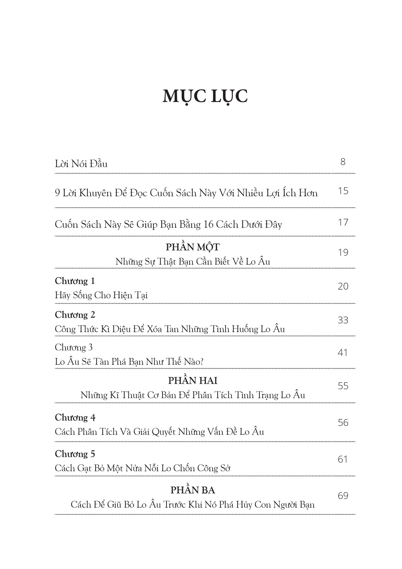 - QUẲNG GÁNH LO ĐI VÀ VUI SỐNG Cuốn sách bao gồm 10 phần khác nhau, với rất nhiều những kinh nghiệm và các lời khuyên từ tác giả cũng như những người đi trước, giúp bạn có thể nhận thức được những điều đúng đắn nhất. Chi tiết Phần 1. Những sự thật bạn cần biết về lo âu Phần 2. Những kĩ thuật cơ bản để phân tích tình trạng lo âu Phần 3. Cách để giũ ỏ âu lo trước khi nó phá huỷ con người Phần 4. 7 cách vun đắp mảnh đất tinh thần để bạn trở nên vui vẻ và hạnh phúc hơn mỗi ngày Phần 5. Nguyên tắc vàng để xoá bỏ lo âu Phần 6. Cách chống lại lo âu khi bị chỉ trích Phần 7. Mệt mỏi dần tan biến - Tinh thần lên đỉnh cao Phần 8. Tìm việc đúng ý gặt hái thành công Phần 9. Cách giảm bớt nỗ lo tài chính