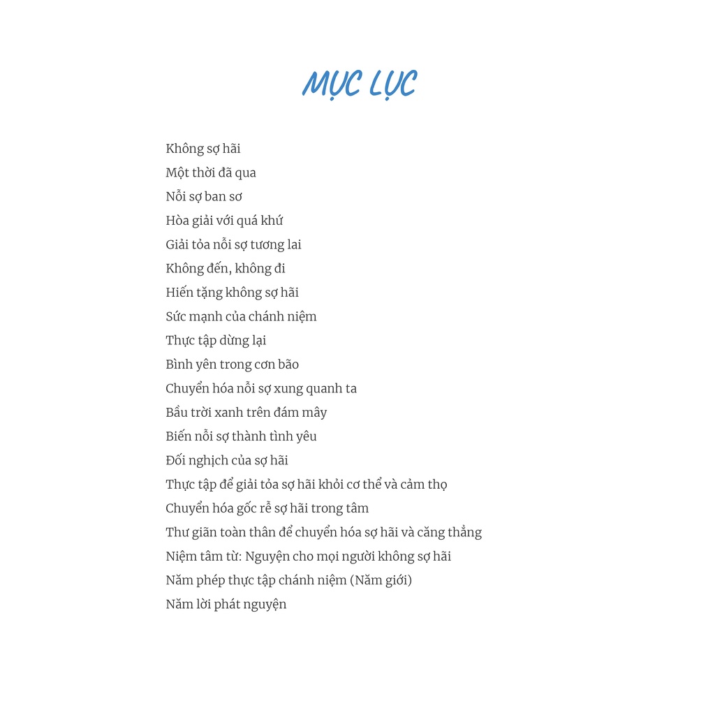 theo ngài và hô lớn bảo ngài dừng lại nhưng Bụt vẫn tiếp tục chậm rãi bình thản bước. Angulimala đuổi kịp Bụt và lớn tiếng hỏi tại sao ngài không chịu dừng lại. Đức Bụt trả lời: “Angulimala, ta đã dừng lại từ lâu, chỉ có ngươi là không dừng lại”. Và Bụt giải thích tiếp: “Ta đã dừng những hành động gây đau khổ. Tất cả các loài chúng sinh đều ham sống, sợ chết. Chúng ta phải nuôi dưỡng lòng thương và bảo vệ sự sống của mọi loài.” Angulimala tỉnh ngộ và xin Bụt giảng tiếp. Cuối cùng, Angulimala thề sẽ không bao giờ giết chóc, bạo ngược và xin Bụt xuất gia. Tại sao Đức Thế Tôn có thể bình tĩnh trước một tên giết người? Đây là một câu chuyện hiếm có nhưng tất cả chúng ta hằng ngày đều đã đối diện với hết lo sợ này đến lo sợ khác. Thực tập chánh niệm mỗi ngày có thể giúp ích rất nhiều. Thái Hà Books trân trọng giới thiệu tới bạn đọc cuốn sách “Fear – sợ hãi” của Thiền sư Thích Nhất Hạnh, với hơi thở, với tỉnh thức, chúng ta có thể đối xử với bất cứ điều gì xảy đến cho ta, để chúng ta cùng nhận diện không sợ hãi không ch