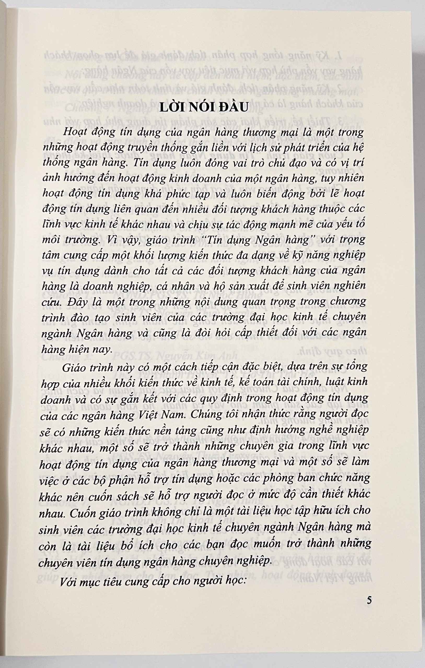 Giáo trình này có một cách tiếp cận đặc biệt, dựa trên sự tổng hợp của nhiều khối kiến thức về kinh tế, kế toán tài chính, luật kinh doanh và có sự găn kết với các quy định trong hoạt động tín dụng của các ngân hàng Việt Nam. Chúng tôi nhận thức rằng người đọc sẽ có những kiến thức nền tảng cũng như định hướng nghề nghiệp khác nhau, một số sẽ trở thành những chuyên gia trong lĩnh vực hoạt động tín dụng của ngân hàng thương mại và một số sẽ làm việc ở các bộ phận hỗ trợ tín dụng hoặc các phòng ban chức năng khác nên cuốn sách sẽ hỗ trợ người đọc ở mức độ cần thiết khác nhau. Cuốn giáo trình không chỉ là một tài liệu học tập hữu ích cho sinh viên các trường đại học kinh tế chuyên ngành Ngân hàng mà còn là tài liệu bổ ích cho các bạn đọc muốn trở thành những chuyên viên tín dụng ngân hàng chuyên nghiệp.