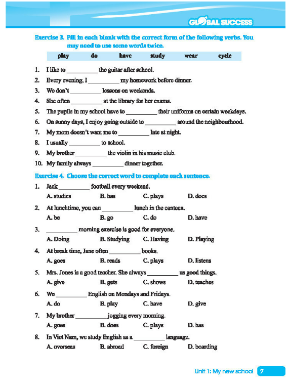 -Phần bài tập cơ bản: được thiết kế để giúp các em củng cố và hiếu sâu hơn về kiến thức tiếng Anh được học trong từng đơn vị bài học trên lớp. Các bài tập ở phần này giúp các em áp dụng những kiến thức đã học vào các tình huống thực tế, từ vựng, ngữ pháp đến rèn luyện các kĩ năng đọc, viết, giao tiếp.