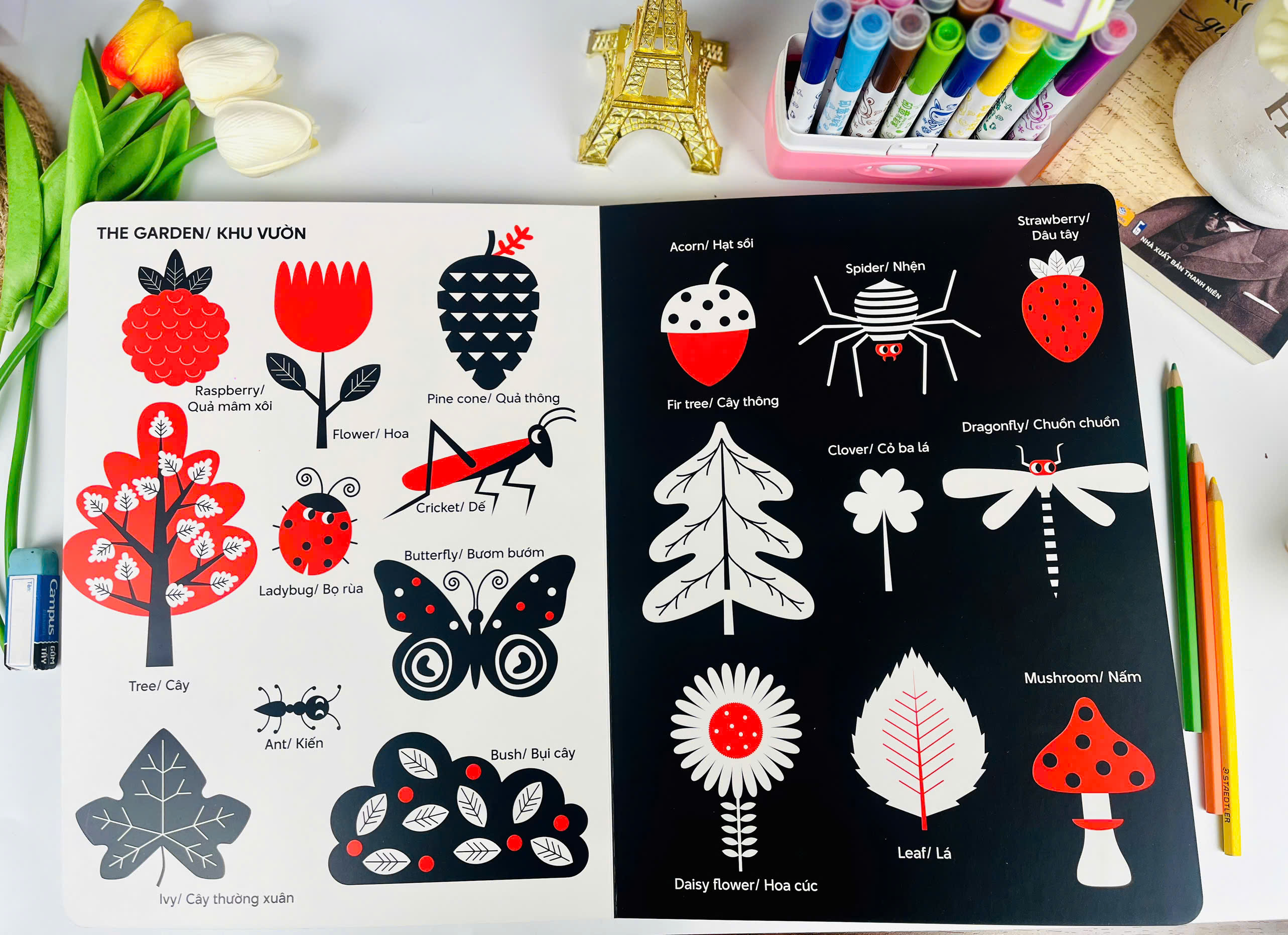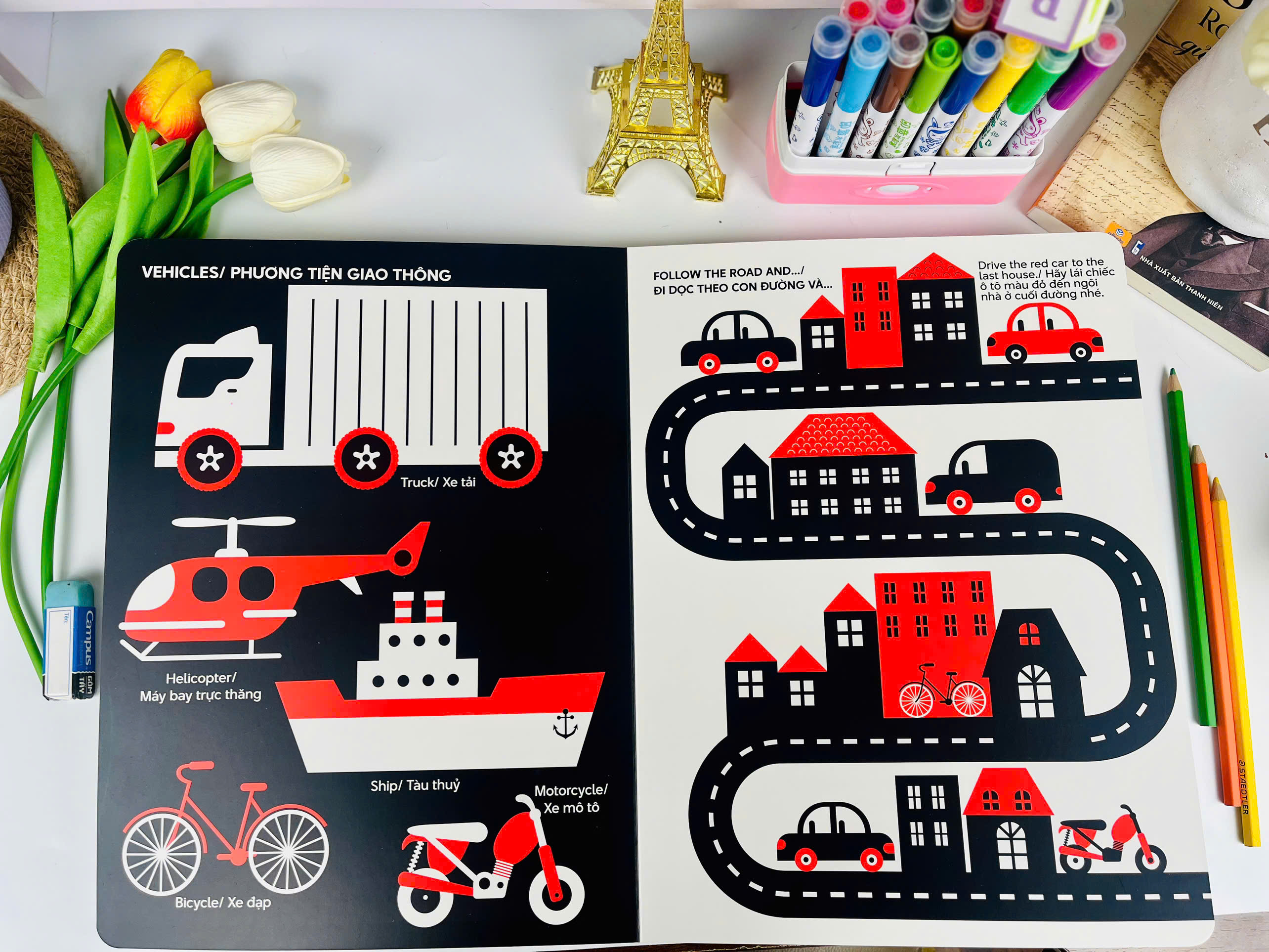 ✿ Sách với màu sắc Đen - Đỏ cơ bản, kết hợp với các khối hình đơn sắc to, rõ ràng sẽ kích thích thị giác và não bộ trẻ sơ sinh phát triển, bộ sách với rất nhiều chủ đề Hình khối, Động vật, Quả, Phương tiện sẽ giúp bé vừa nhận biết vừa rèn thói quen đọc sách từ bé hiệu quả.