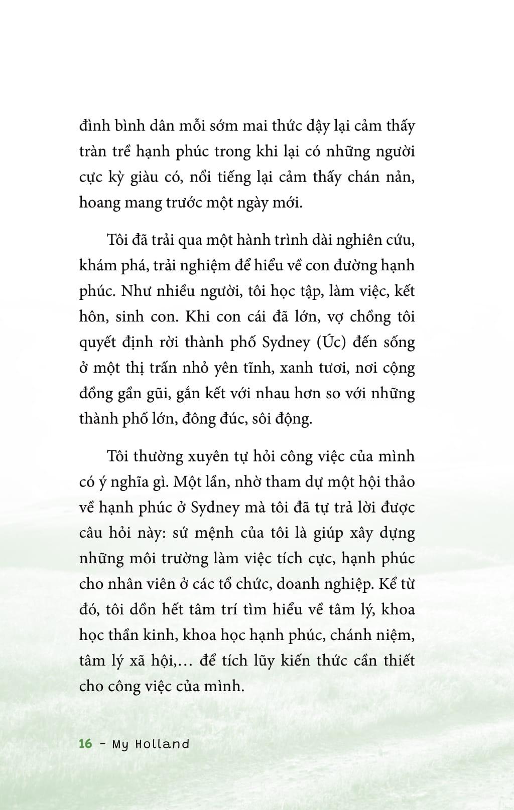 Hạnh Phúc Bao Giờ Gọi Tên Ta Đã bao giờ bạn tự hỏi: “Mình có đang hạnh phúc không?”. Câu hỏi này không hề… vớ vẩn chút nào đâu. Ai cũng có đầy đủ lý do để hạnh phúc nhưng sao rất nhiều người lại không cảm thấy hạnh phúc? Vì sao quá nhiều người bận rộn kiếm tìm hạnh phúc mà không hề nhận ra hạnh phúc đang hiển hiện ngay trước mắt? Cuốn sách "Hạnh Phúc Bao Giờ Gọi Tên Ta" của tác giả My Holland là một hành trình khám phá sâu sắc về khái niệm hạnh phúc và cách để từng bước xây dựng nó trong cuộc sống hằng ngày. Được viết bằng giọng văn chân thành, gần gũi, cuốn sách không chỉ mang đến những lý thuyết về tâm lý học mà còn là những trải nghiệm thực tế, bài học quý giá từ chính cuộc sống của tác giả. Cuốn sách được chia thành nhiều chương, mỗi chương đi sâu vào một chủ đề cụ thể, từ việc định nghĩa hạnh phúc đến cách nâng cao cảm xúc tích cực và phát triển tính cách. Tác giả My Holland mở đầu bằng những câu hỏi sâu sắc: "Hạnh phúc là gì?" và "Vì đâu hạnh phúc xa tầm với?" Qua đó, độc giả sẽ nhận ra rằng hạnh phúc không phải là một đích đến mà là một hành trình. Một trong những điểm nổi bật của cuốn sách là sự phân biệt giữa hạnh phúc và cảm giác hài lòng. Tác giả nhấn mạnh rằng hạnh phúc thực sự đến từ việc cảm nhận và trân trọng những gì m.ình đang có, thay vì luôn tìm kiếm những điều tốt hơn. Điều này giúp độc giả nhận ra giá trị của những khoảnh khắc giản dị trong cuộc sống. My Holland cũng chỉ ra rằng tính cách đóng vai trò quyết định trong việc cảm nhận hạnh phúc. Các chương về việc tự nâng ngưỡng hạnh phúc của bản thân và phát triển những tính cách tích cực như sự vị tha, lòng biết ơn, và tinh thần lạc quan là những phần rất đáng chú ý. Tác giả khuyến khích độc giả tìm kiếm và nuôi dưỡng những phẩm chất tốt đẹp bên trong m.ình để từ đó tạo nên nguồn hạnh phúc bền vững. Không chỉ dừng lại ở khía cạnh cá nhân, cuốn sách này còn mở rộng ra môi trường làm việc. Tác giả đưa ra những bí quyết giúp độc giả tìm kiếm hạnh phúc trong công việc, điều này rất quan trọng trong thế giới hiện đại, nơi mà nhiều người cảm thấy căng thẳng và không hài lòng với công việc của m.ình. Qua những câu chuyện thực tế và nghiên cứu khoa học, My Holland chỉ ra rằng một nhân viên hạnh phúc sẽ cống hiến hết m.ình cho công việc, từ đó tạo ra môi trường làm việc tích cực và hiệu quả. Ngoài ra, cuốn sách còn cung cấp những lời khuyên thực tiễn và dễ áp dụng trong cuộc sống hàng ngày, từ việc thực hành lòng biết ơn, rèn luyện thể dục thể thao, đến việc chăm sóc sức khỏe tinh thần thông qua thiền định và các hoạt động xã hội. Những hoạt động này không chỉ giúp cải thiện chất lượng cuộc sống mà còn tạo ra những kết nối tích cực với những người xung quanh. "Hạnh Phúc Bao Giờ Gọi Tên Ta" là một cuốn sách không thể bỏ qua cho những ai đang tìm kiếm sự bình yên trong tâm hồn và hạnh phúc thực sự. Tác phẩm này không chỉ dừng lại ở lý thuyết mà còn khuyến khích độc giả hành động và thực hiện những thay đổi tích cực trong cuộc sống. Cuốn sách chắc chắn sẽ là một người bạn đồng hành quý giá trong hành trình khám phá bản thân và tìm kiếm hạnh phúc thực sự. Dù bạn là ai, bạn hoàn toàn có thể sống hạnh phúc. Cuốn sách này sẽ dẫn đường cho bạn