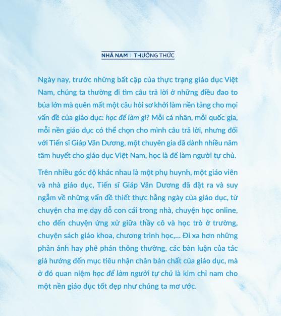 Mua tại TiktokTác giả GIÁP VĂN DƯƠNG Nhà xuất bản Công Thương Kích thước 20.5 x 14 x cm Số trang 324 Ngày phát hành 2024 Giới thiệu sách Ngày nay, trước những bất cập của thực trạng giáo dục Việt Nam, chúng ta thường đi tìm câu trả lời ở những điều đao to búa lớn mà quên mất một câu hỏi sơ khởi làm nền tảng cho mọi vấn đề của giáo dục: học để làm gì? Mỗi cá nhân, mỗi quốc gia, mỗi nền giáo dục có thể chọn cho mình câu trả lời, nhưng đối với Tiến sĩ Giáp Văn Dương, một chuyên gia đã dành nhiều năm tâm huyết cho giáo dục Việt Nam, học là để làm người tự chủ. Trên nhiều góc độ khác nhau là một phụ huynh, một giáo viên và nhà giáo dục, Tiến sĩ Giáp Văn Dương đã đặt ra và suy ngẫm về những vấn đề thiết thực hằng ngày của giáo dục, từ chuyện cha mẹ dạy dỗ con cái trong nhà, chuyện học online, cho đến chuyện ứng xử giữa thầy cô và học trò ở trường, chuyện sách giáo khoa, chương trình học... Đi xa hơn những phản ánh hay phê phán thông thường, các bàn luận của tác giả hướng đến mục tiêu nhận chân bản chất của giáo dục, mà ở đó quan niệm học để làm người tự chủ là kim chỉ nam cho một nền giáo dục tốt đẹp như chúng ta mơ ước.