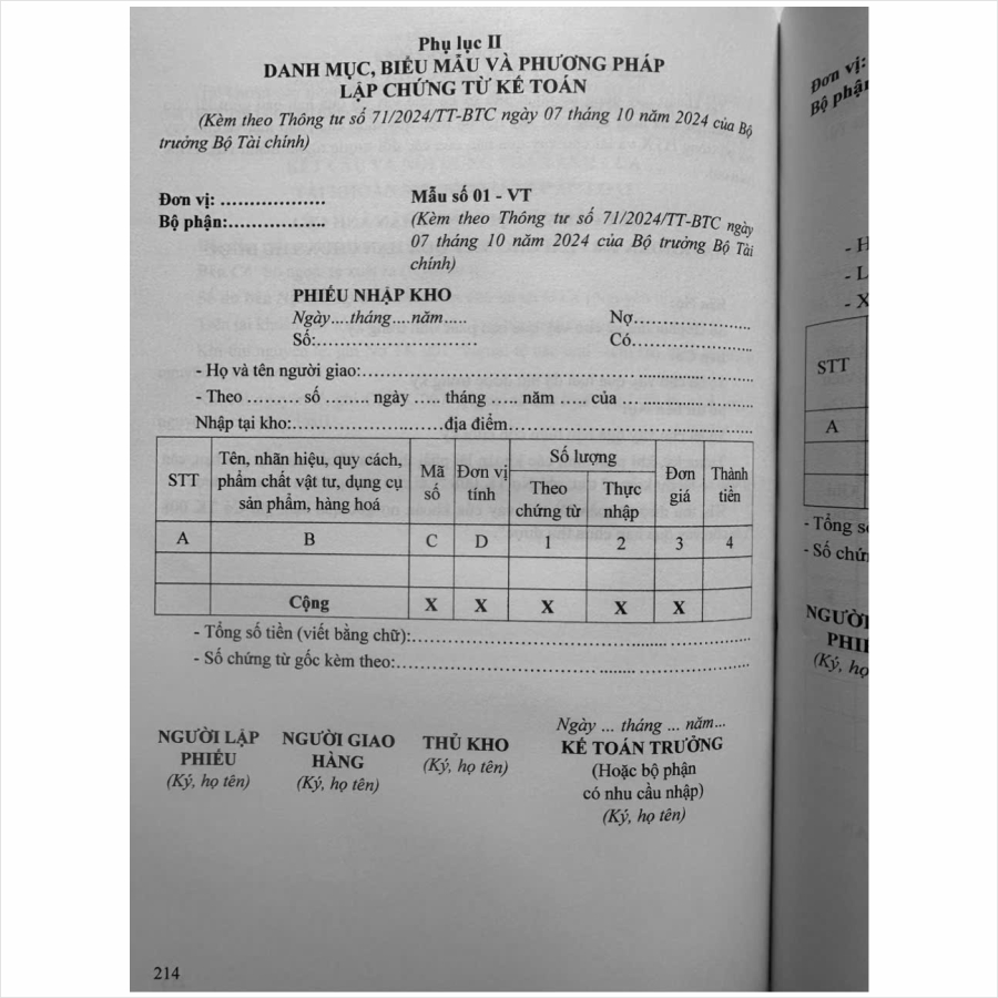 - Toàn bộ sách bìa mềm khổ lớn 19 x 27 cm phân phối bởi Nhà sách Nam Việt đều được bọc sách Plastic MIỄN PHÍ và xuất hóa đơn điện tử đầy đủ, nhanh chóng. …//… Lời giới thiệu: Ngày 07 tháng 10 năm 2024, Bộ Tài chính đã chính thức ban hành Thông tư số 71/2024/TT-BTC hướng dẫn Chế độ kếtoán hợp tác xã, liên hiệp hợp tác xã. Nhằm hướng dẫn về chứng từ kế toán, tài khoản kế toán, nguyên tắc ghi sổ kế toán, lập và trình bày Báo cáo tài chính của hợp tác xã, liên hiệp hợp tác xã; không áp dụng cho việc xác định nghĩa vụ thuế của hợp tác xã đối với ngân sách Nhà nước. Việc ghi sổ kế toán phải căn cứ vào các chứng từ kế toán được phản ánh trên cơ sở các giao dịch kinh tế phát sinh và đã hoàn thành. Hợp tác xã phải tuân thủ các quy định của pháp luật, cơ chế, chính sách liên quan khi thực hiện các giao dịch kinh tế. Nhằm phổ biến đến Quý Cơ quan, Đơn vị và Quý khách hàng thân thiết nắm bắt kịp thời những quy định mới nêu trên. Nhà sách Nam Việt xin trân trọng giới thiệu cuốn sách: Hướng Dẫn Chế Độ Kế Toán Hợp Tác Xã, Liên Hiệp Hợp Tác Xã theo Thông Tư Số 71/2024/TT-BTC ngày 07/10/2024 …//… Nội dung cuốn sách bao gồm những nội dung chính như sau: Chương I. QUY ĐỊNH CHUNG Chương II. QUY ĐỊNH CỤ THỂ Chương III. ĐIỀU KHOẢN THI HÀNH Phụ lục I. DANH MỤC HỆ THỐNG TÀI KHOẢN KẾ TOÁN Phụ lục II. DANH MỤC, BIỂU MẪU VÀ PHƯƠNG PHÁP LẬP CHỨNG TỪ KẾ TOÁN Phụ lục III. DANH MỤC SỔ KẾ TOÁN, BIỂU MẪU SỔ KẾ TOÁN VÀ PHƯƠNG PHÁP GHI SỔ KẾ TOÁN VÀ HÌNH THỨC SỔ KẾ TOÁN Phụ lục IV. BIỂU MẪU BÁO CÁO TÀI CHÍNH, NỘI DUNG VÀ PHƯƠNG PHÁP LẬP, TRÌNH BÀY BÁO CÁO TÀI CHÍNH *** Quý khách hàng hãy an tâm khi mua sách tại Nhà sách Nam Việt, cam kết uy tín, chất lượng, sách bản gốc chuẩn đẹp, được kiểm hàng, hài lòng mới thanh toán, sách đã được bọc plastic cao cấp miễn phí! …//… Cảm ơn các bạn đã ghé thăm shop Nhà sách Nam Việt ! Sách Hướng Dẫn Chế Độ Kế Toán Hợp Tác Xã, Liên Hiệp Hợp Tác Xã theo Thông Tư Số 71/2024/TT-BTC ngày 07/10/2024 Sách Hướng Dẫn Chế Độ Kế Toán Hợp Tác Xã, Liên Hiệp Hợp Tác Xã theo Thông Tư Số 71/2024/TT-BTC ngày 07/10/2024