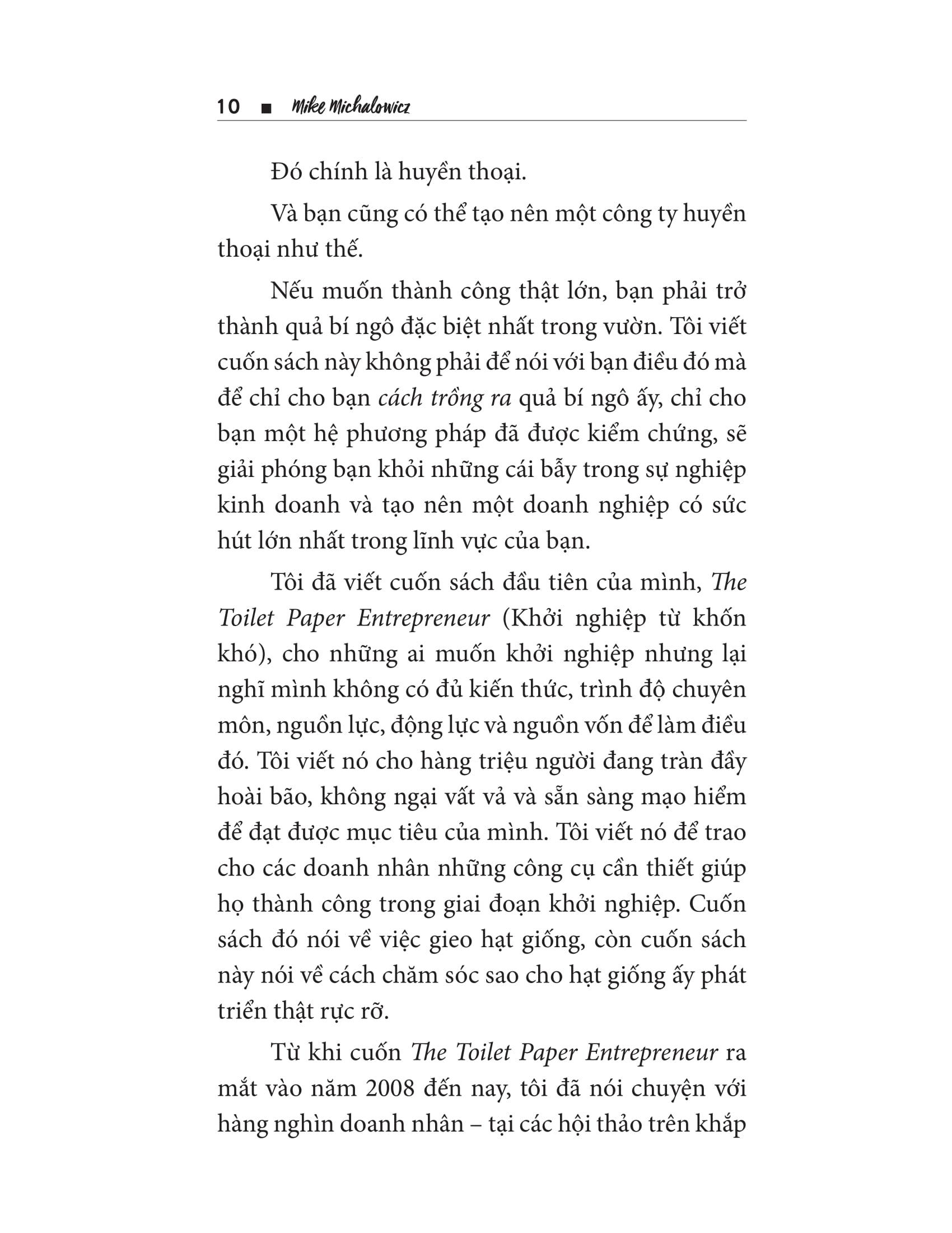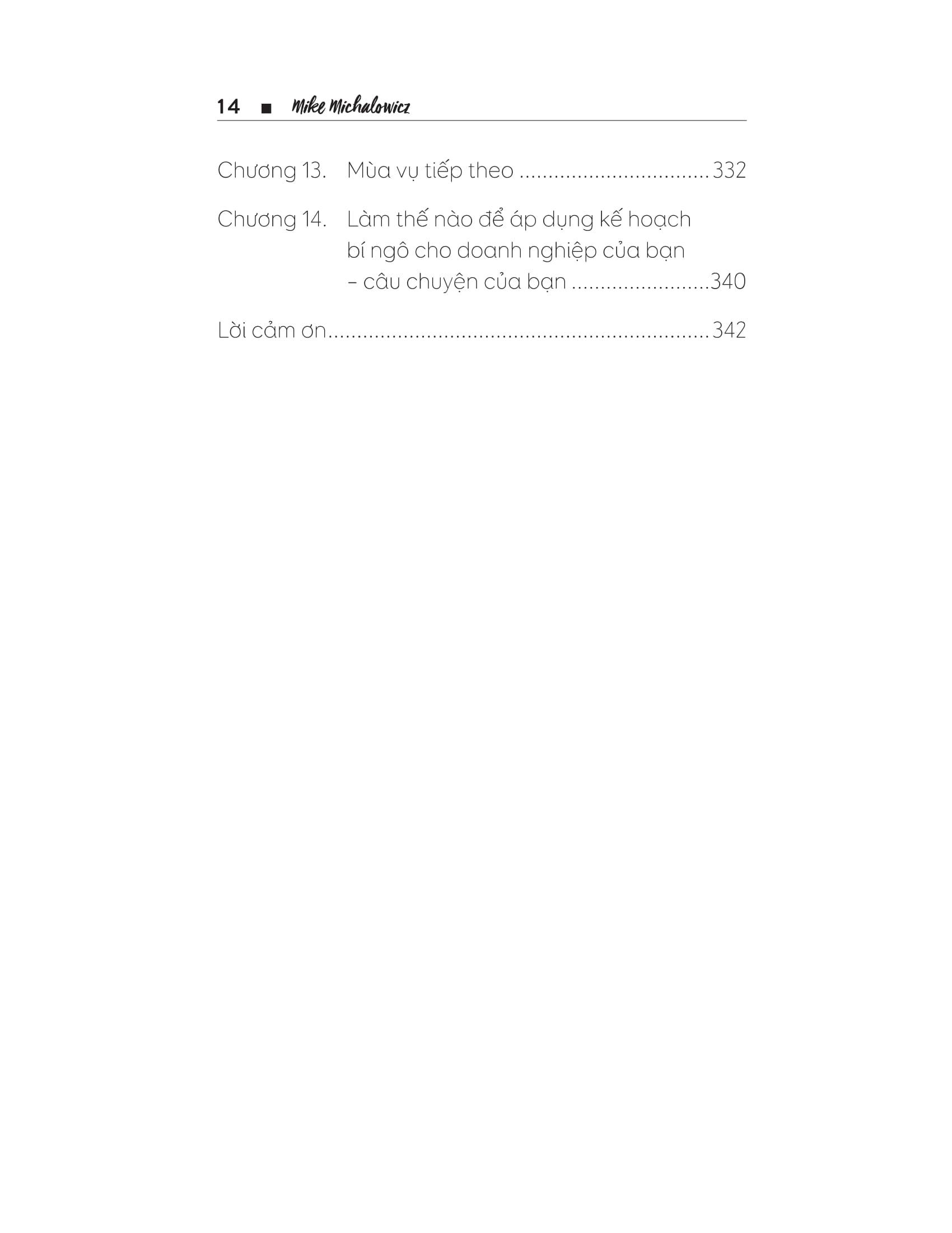 - Các sinh viên chuẩn bị bước vào thị trường lao động, những nhân viên, bất cứ ai mong muốn đóng góp điều gì đó có ý nghĩa cho thế giới này. THÔNG TIN TÁC GIẢ Mike Michalowicz Trước tuổi 35, ông đã thành lập và bán thành công hai công ty trị giá hàng triệu đô-la. Ông sáng lập Profit First, một công cụ được hàng trăm nghìn công ty trên toàn cầu sử dụng để thúc đẩy lợi nhuận. Ông là tác giả của nhiều đầu sách như: Fix This Next, Surge, The Pumpkin Plan, Profit First và The Toilet Paper Entrepreneur. Ông từng là chuyên gia bình luận về doanh nghiệp nhỏ cho tờ The Wall Street Journal và dẫn chương trình giải cứu doanh nghiệp trên MSNBC. Mike là diễn giả chính nổi tiếng trên các diễn đàn về chủ đề khởi nghiệp sáng tạo, đồng thời còn là diễn giả khách mời cho các chương trình khởi nghiệp tại các trường đại học như Columbia, Copenhagen Business School, Emerson, Harvard, Penn State, Pepperdine và Princeton. ĐÁNH GIÁ/ NHẬN XÉT CỦA BÁO CHÍ/CHUYÊN GIA “Mỗi trang, mỗi chương, khi đọc cuốn sách này, tôi đều tự hỏi, sao m.ình lại không nghĩ ra nhỉ? Thật đáng kinh ngạc! Quả là một cuốn sách tuyệt vời. Một quả bí ngô! Ai mà ngờ được chứ? Tất cả các doanh nhân, chủ doanh nghiệp, hãy đọc nó đi! Hãy làm ngay đi!” —Michael Gerber, tác giả của The E-Myth và là người sáng tạo ra The E-Myth Evolution “Một cuốn sách tuyệt vời khác của Mike Michalowicz! Sự hài hước ngẫu hứng và hiểu biết sâu sắc về kinh doanh của Mike đảm bảo rằng Kế hoạch bí ngô là một cuốn sách mà các doanh nhân nên đọc trong nhiều năm tới.”—Guy Kawasaki, tác giả của Enchantment và The Art of the Start “Những lời khuyên sâu sắc, thẳng thắn hướng đến những doanh nhân đang mắc kẹt giữa sự chung chung thay vì cụ thể, có ý nghĩa. Rất nhiều hạt giống đáng để gieo trồng.”—Seth Godin, tác giả của Con bò tía “Michalowicz lại một lần nữa thành công rực rỡ. Kế hoạch bí ngô tràn ngập sự hài hước tuyệt vời của Mike và là một hướng dẫn từng bước phi thường dành cho những doanh nhân đang gặp khó khăn trong việc phát triển kinh doanh.”—J. J. Ramberg, người dẫn chương trình Your Business của MSNBC “Với phong cách ‘điên rồ như cáo’, Mike Michalowicz tiết lộ lý do tại sao việc bắt chước một người nông dân trồng bí ngô lại mang đến cho bạn thành công vượt trội. Michalowicz đang nhanh chóng trở thành một trong những tác giả kinh doanh sáng tạo nhất thời đại.”—Rieva Lesonsky, Giám đốc điều hành của GrowBiz Media, cựu biên tập viên tạp chí Entrepreneur “Mike giúp việc biến doanh nghiệp của bạn từ bình thường thành phi thường trở nên dễ dàng như làm theo một công thức đơn giản từng bước. Cuốn sách này hé lộ những kiến thức và sự thông thái mà tôi hiếm khi thấy trong các tác phẩm trước đây. Nếu bạn chỉ đọc một cuốn sách trong năm nay, hãy chọn Kế hoạch bí ngô.”—Bob Burg, đồng tác giả của The Go-Giver và Endless Referrals TRÍCH ĐOẠN “Kinh doanh không phải là một cuộc ganh đua về danh tiếng. Đừng bận tâm về việc phải có được nhiều khách hàng nhất. Hãy gây dựng một doanh nghiệp có thể đáp ứng nhu cầu của những khách hàng tốt nhất... phù hợp với bạn nhất. Bạn không cần phải được bầu chọn làm nữ hoàng của buổi dạ tiệc, mà chỉ cần một nhóm bạn thân thiết với tính cách tuyệt vời và tấm lòng kiên định, những người sẵn sàng làm mọi thứ vì bạn, cũng như bạn luôn sẵn sàng vì họ. Hãy luôn là chính m.ình và đừng bao giờ thỏa hiệp.” “Bạn cần nhớ một điều rằng, cũng như trong một vườn bí ngô, việc diệt trừ cỏ dại là một quá trình không ngừng nghỉ. Các công ty đều sẽ thay đổi và khách hàng cũng có kẻ đi người đến. Khi đã nắm được cách thực hiện, cứ mỗi quý, bạn hãy lập một Bảng đánh giá mới. Hãy dành riêng một hoặc hai ngày để đánh giá khách hàng và đưa ra những quyết định khó khăn mà giờ đây đã trở nên quen thuộc. Bạn sẽ chẳng bao giờ biết khi nào thì một cọng cỏ dại đáng ghét hay một quả bí ngô nhiễm bệnh sẽ lẻn vào thôn tính toàn bộ khu vườn của bạn đâu.” “Trong nhiều năm qua, tôi đã phát triển được Bộ ba câu hỏi, tuy đơn giản nhưng lại vô cùng hiệu quả. Nếu được hỏi theo đúng thứ tự, ba câu hỏi này sẽ giúp nhân viên suy nghĩ và đưa ra những quyết định luôn có lợi nhất cho công ty của bạn. Vì chúng rất hiệu quả, nên có lẽ bạn sẽ muốn in một bản các câu hỏi này ra và dán chúng lên bàn làm việc của từng nhân viên... Đây là Bộ ba câu hỏi, sắp xếp đúng thứ tự: