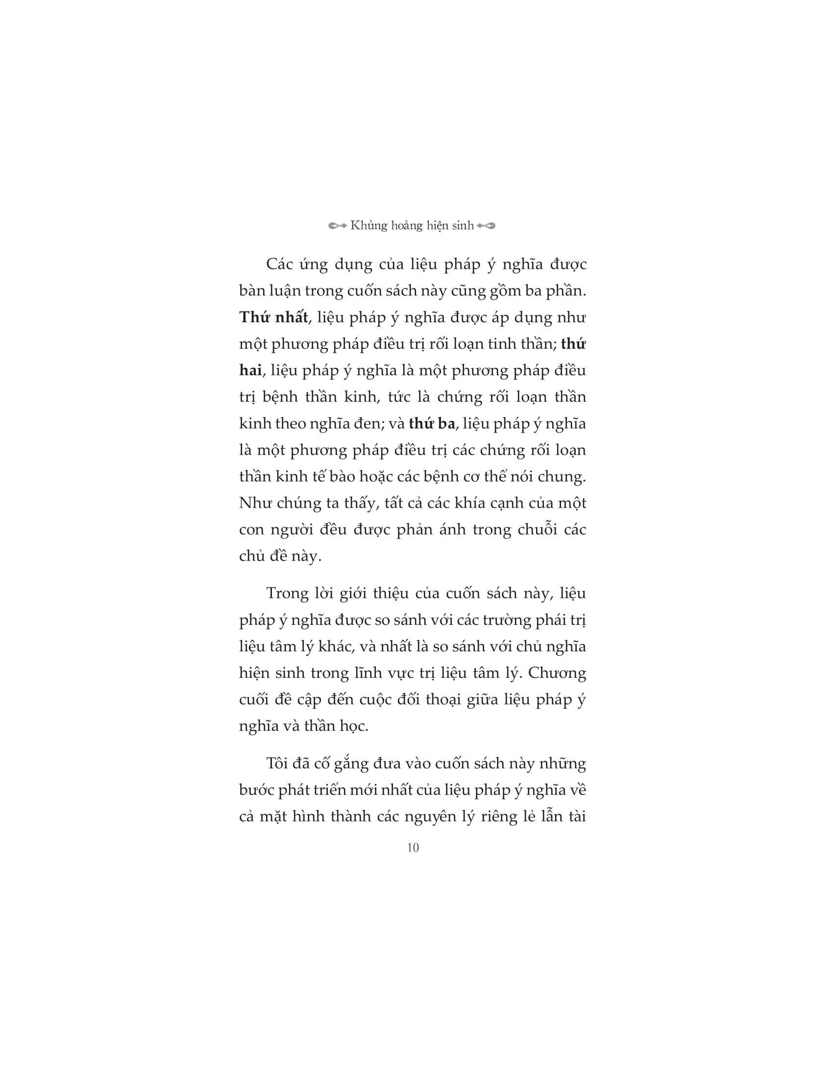 Khủng Hoảng Hiện Sinh Chắc hẳn, ai trong chúng ta cũng từng rơi vào trạng thái trống rỗng hiện sinh, một trạng thái mà ta không tìm ra được lẽ sống của cuộc đời m.ình, không biết được chân lý cuộc sống mà m.ình đang theo đuổi là gì. Tình trạng này ngày càng phổ biến trong xã hội hiện đại, khi mà chúng ta bị choáng ngợp bởi những luồng thông tin, hình ảnh trên mạng xã hội và hội chứng sợ bỏ lỡ (FOMO). Trong cuốn sách Khủng hoảng hiện sinh - nhà thần kinh học người Áo Viktor E. Frankl đã hướng dẫn liệu pháp trị liệu tâm lý mang tên “liệu pháp ý nghĩa”. Ông quan niệm rằng, cuộc đời của ai cũng có một lẽ sống. Cuốn sách sẽ là một bức tranh toàn cảnh về những nguyên lý, tổng hợp tài liệu minh họa hình ảnh và những câu chuyện thực tế xoay quanh liệu pháp này. Viktor muốn truyền tải một niềm tin chắc chắn rằng, bất chấp sự sụp đổ của những lý lẽ thông thường, cuộc sống của mỗi người đều có những ý nghĩa riêng, và ý nghĩa đó vẫn sẽ luôn vẹn nguyên cho đến khi ta trút hơi thở cuối cùng. Cuốn sách này giúp bạn: