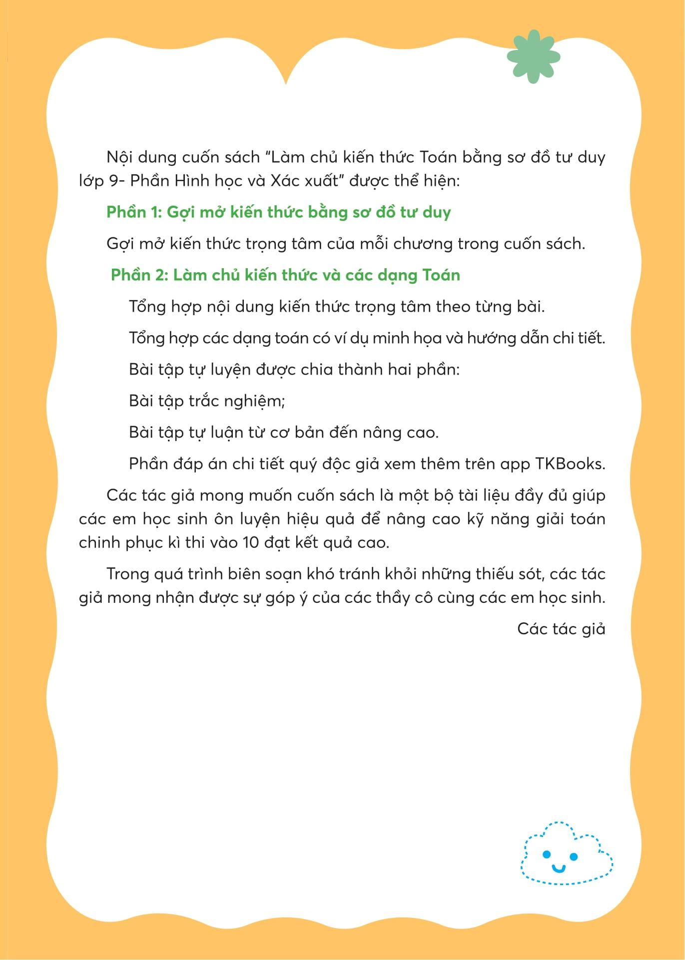 Hiểu được áp lực và khó khăn trong việc học môn Toán, TKBooks đã hợp tác cùng các tác giả xuất bản cuốn sách “Làm chủ kiến thức Toán bằng sơ đồ tư duy lớp 9 – Luyện thi vào lớp 10: Phần Hình học và Xác suất”. Cuốn sách bám sát nội dung chương trình sách giáo khoa Toán 9, tập trung vào việc hệ thống hóa kiến thức qua sơ đồ tư duy, giúp học sinh: