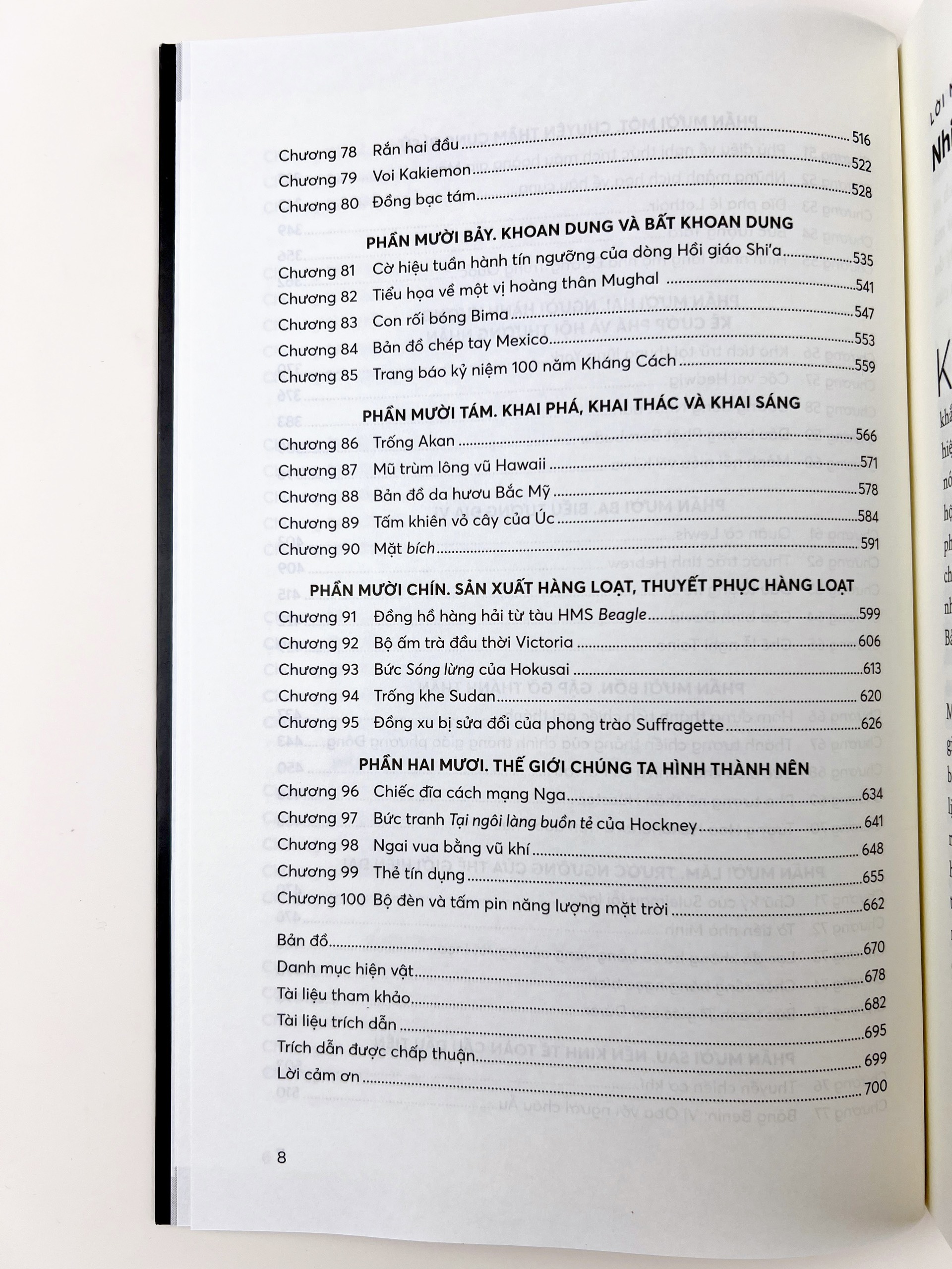 - Hình thức: Bìa mềm GIỚI THIỆU NỘI DUNG: “Lịch sử thế giới qua 100 hiện vật” được viết bởi Neil MacGregor - Nguyên Giám đốc Bảo tàng Anh (2003-2009) giúp chúng ta hiểu rõ hơn về quá trình phát triển của loài người bằng một góc nhìn mới lạ, đó là qua việc kể những câu chuyện lịch sử hấp dẫn, độc đáo xoay quanh các hiện vật tiêu biểu được trưng bày tại Bảo tàng Anh. Bảo tàng Anh được thành lập năm 1753 với định hướng là “nhắm tới giá trị phổ quát” và mở cửa tự do cho tất cả. Nơi đây đã có thâm niên hơn 250 năm sưu tầm hiện vật từ khắp thế giới, với gần 8.000.000 hiện vật được cất giữ và trưng bày tại đây, là các tác phẩm nghệ thuật vô giá và những báu vật của mọi nền văn minh của nhân loại trên thế giới – Ai Cập, Ba Tư, Hy Lạp, La Mã, Trung Hoa… Cuốn sách này là bản ghi chép từ chương trình trên đài BBC Radio 4, được phát thanh vào năm 2010, như một hoạt động đổi mới liên tục của Bảo tàng, mang lại cho Bảo tàng Anh giải thưởng “Bảo tàng của năm” (Art Fund Prize 2011). Bảo tàng và đài BBC đã chọn ra 100 hiện vật từ bộ sưu tập của Bảo tàng Anh và sắp xếp theo niên đại từ khởi nguồn lịch sử nhân loại vào khoảng hai triệu năm trước cho đến tận ngày nay. Những hiện vật đó bao quát toàn bộ thế giới, phân bố đều hết mức có thể, cố gắng đề cập đến càng nhiều khía cạnh thực tiễn trong trải nghiệm của nhân loại càng tốt, và kể cho chúng ta nghe về muôn mặt đời sống xã hội, chứ không chỉ về giới giàu sang quyền quý trong lòng nó. Bởi thế, số hiện vật này tất yếu bao gồm cả những món đồ giản dị trong đời sống thường nhật lẫn những công trình nghệ thuật kỳ vĩ. Một số hiện vật như: một công cụ chặt 2 triệu năm tuổi, một chiếc áo choàng bằng vàng của xứ Wales, tàu chiến cơ khí, tượng Phật ở Pakistan hay chiếc đồng hồ hàng hải trên tàu HMS Beagle.
