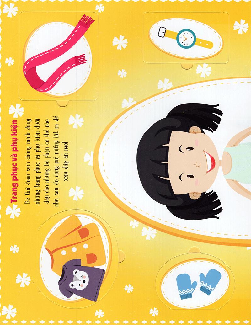 Bố mẹ và bé hãy mở cuốn sách này ra rồi lật những miếng ghép lên để cùng học rất nhiều từ song ngữ Việt – Anh về cơ thể người nhé!