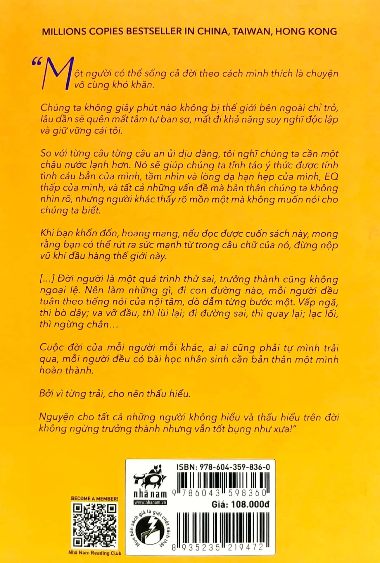 So với từng câu từng câu an ủi dịu dàng, tôi nghĩ chúng ta cần một chậu nước lạnh hơn. Nó sẽ giúp chúng ta tỉnh táo ý thức được tính tình cáu bẳn của mình, tầm nhìn và lòng dạ hạn hẹp của mình, EQ thấp của mình, và tất cả những vấn đề mà bản thân chúng ta không nhìn rõ, nhưng người khác thấy rõ mồn một mà không muốn nói cho chúng ta biết.