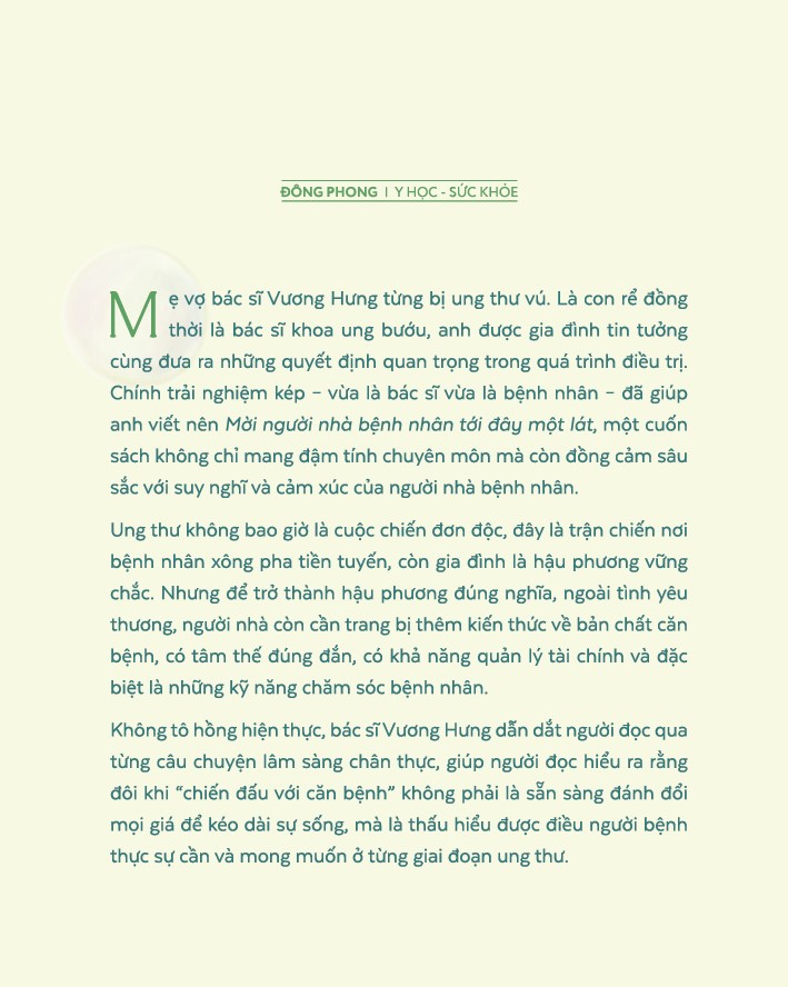 Mẹ vợ bác sĩ Vương Hưng từng bị ung thư vú. Là con rẻ đồng thời là bác sĩ khoa ung bướu, anh được gia đình tin tưởng cùng đưa ra những quyết định quan trọng trong quá trình chữa. Chính trải nghiệm kép - vừa là bác sĩ vừa là bệnh nhân - đã giúp anh viết nên Mời người nhà bệnh nhân tới đây một lát, một cuốn sách không chỉ mang đậm tính chuyên môn mà còn đồng cảm sâu sắc với suy nghĩ và cảm xúc của người nhà bệnh nhân.