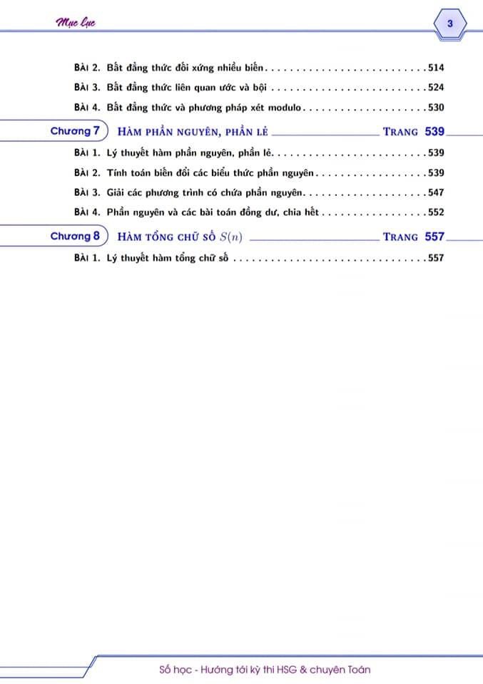 Chương 1 : Chia hết, Ước và bộ Chương 2 : Số nguyên Tố, hợp số Chương 3 : Số Chính Phương, Số Lập phương, căn thức Chương 4 : Phương Trình Nghiệm nguyên Chương 5 : Tính chất số học của Đa thức Chương 6: Bất đẳng thức trong Số học Chương 7 : Hàm phần nguyên, phần lẻ Chương 8 : Hàm Tổng chữ số