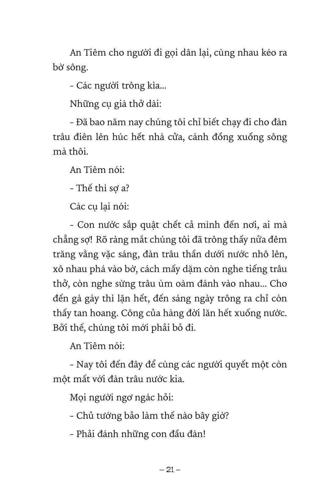 “Vua Hùng nắm lấy tay An Tiêm đưa lên thềm bè. Rồi lại ra dắt tay từng người vào ngồi chiếu miến trải trong rạp. Bốn phía chen chúc những cánh thuyền hân hoan lướt đến xem mặt cả nhà An Tiêm, cùng lúc chiêng rền dậy mặt nước…”