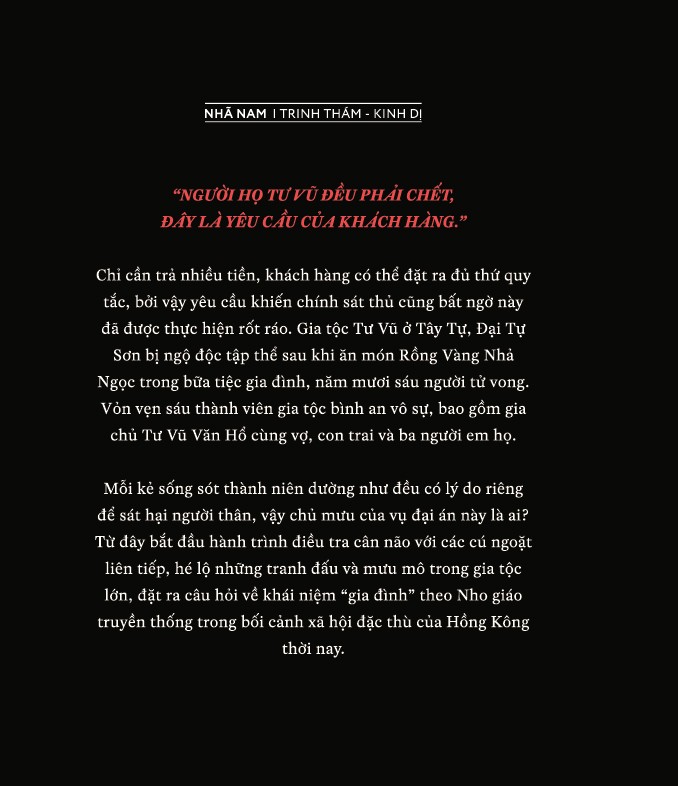 Nhà phát hành: Nhã Nam Nhà xuất bản: Hội Nhà Văn Tác giả: Albert Tam Dịch giả: Hồng Hạnh Số trang: 457 Kích thước: 14 x 20.5 cm   "NGƯỜI HỌ TƯ VŨ ĐỀU PHẢI CHẾT, ĐÂY LÀ YÊU CẦU CỦA KHÁCH HÀNG.”   Chỉ cần trả nhiều tiền, khách hàng có thể đặt ra đủ thứ quy tắc, bởi vậy yêu cầu khiến chính sát thủ cũng bất ngờ này đã được thực hiện rốt ráo. Gia tộc Tư Vũ ở Tây Tự, Đại Tự Sơn bị ngộ độc tập thể sau khi ăn món Rồng Vàng Nhà Ngọc trong bữa tiệc gia đình, năm mươi sáu người tử vong. Vỏn vẹn sáu thành viên gia tộc bình an vô sự, bao gồm gia chủ Tư Vũ Văn Hồ cùng vợ, con trai và ba người em họ.   Mỗi kẻ sống sót thành niên dường như đều có lý do riêng để sát hại người thân, vậy chủ mưu của vụ đại án này là ai? Từ đây bắt đầu hành trình điều tra cân não với các cú ngoặt liên tiếp, hé lộ những tranh đấu và mưu mô trong gia tộc lớn, đặt ra câu hỏi về khái niệm “gia đình” theo Nho giáo truyền thống trong bối cảnh xã hội đặc thù của Hồng Kông thời nay.