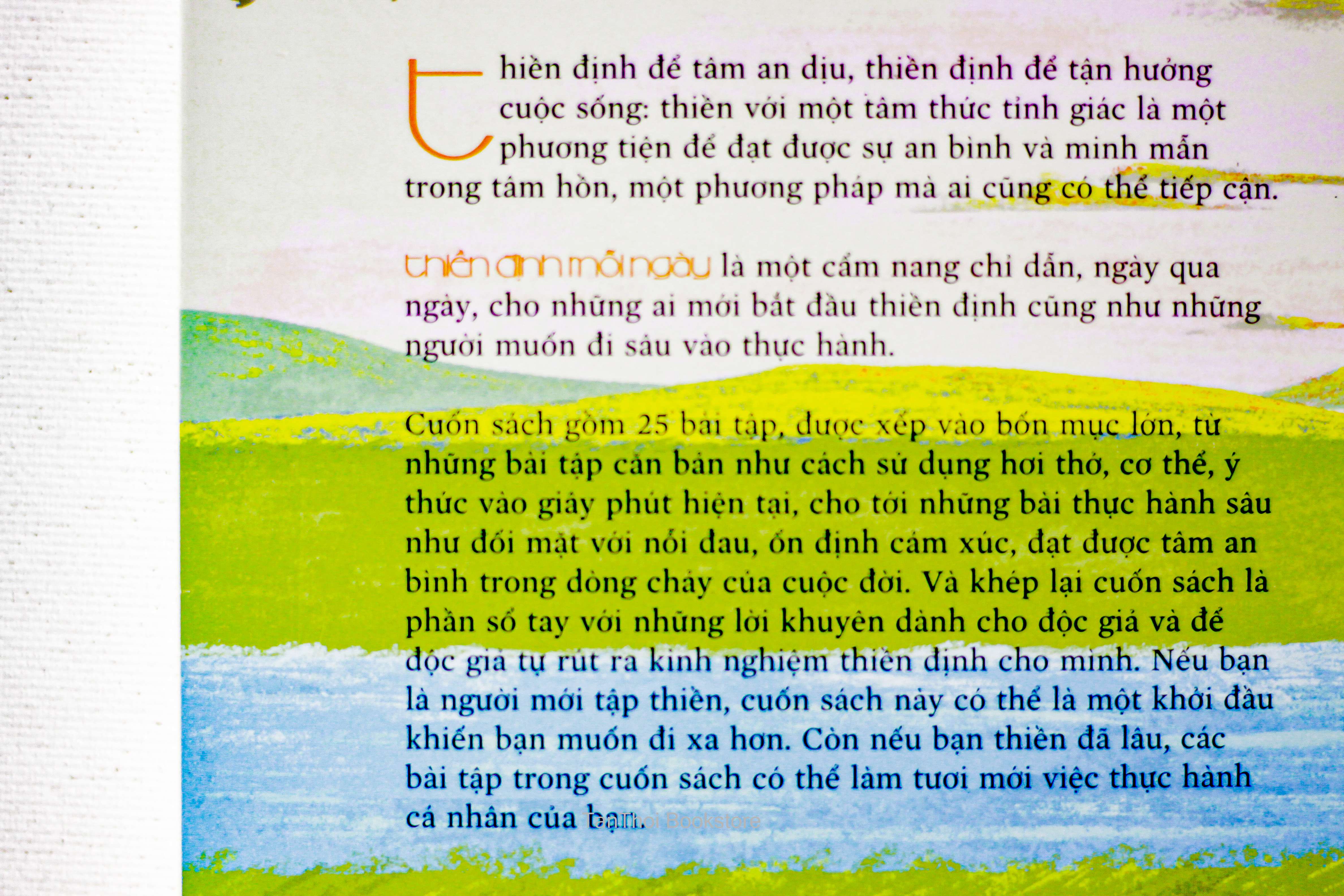 Cuốn sách gồm 25 bài tập, được xếp vào bốn mục lớn, từ những bài tập căn bản như cách sử dụng hơi thở, cơ thể, ý thức vào giây phút hiện tại, cho tới những bài thực hành sâu như đối mặt với nỗi đau, ổn định cảm xúc, đạt được tâm an bình trong dòng chảy của cuộc đời. Và khép lại cuốn sách là phần sổ tay với những lời khuyên dành cho độc giả và để độc giả tự rút ra kinh nghiệm thiền định cho mình. Nếu bạn là người mới tập thiền, cuốn sách này có thể là một khởi đầu khiến bạn muốn đi xa hơn. Còn nếu bạn thiền đã lâu, các bài tập trong cuốn sách có thể làm tươi mới việc thực hành cá nhân của bạn.