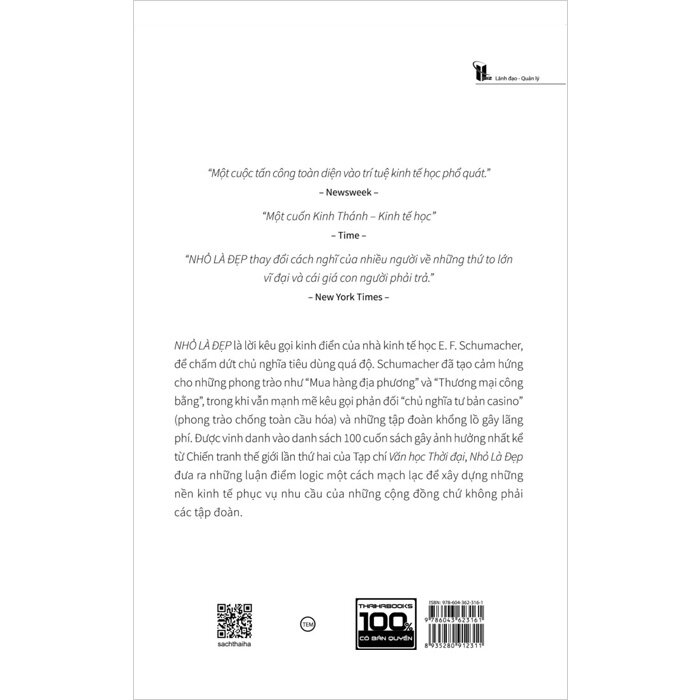 Nhỏ Là Đẹp“Nhỏ là đẹp” là lời kêu gọi kinh điển của nhà kinh tế học E. F. Schumacher tốt nghiệp Oxford, để chấm dứt chủ nghĩa tiêu dùng quá độ. Schumacher đã tạo cảm hứng cho những phong trào như “Mua hàng địa phương” và “Thương mại công bằng”, trong khi vẫn mạnh mẽ kêu gọi phản đối “chủ nghĩa tư bản casino” (phong trào chống toàn cầu hóa) và những tập đoàn khổng lồ gây lãng phí. Được vinh danh vào danh sách 100 cuốn sách gây ảnh hưởng nhất kể từ Chiến tranh thế giới lần thứ hai của Tạp chí Văn học Thời đại, “Nhỏ là đẹp” đưa ra những luận điểm logic một cách mạch lạc để xây dựng những nền kinh tế phục vụ nhu cầu của những cộng đồng chứ không phải các tập đoàn.