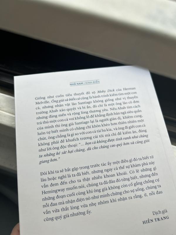 Đôi khi ta sẽ bắt gặp trong trước tác ấy một điều gì đó ta biết từ lâu hoặc nghĩ là ta đã biết, nhưng ngay cả thế sự khám phá này vẫn đem đến cho ta thật nhiều khoan khoái. Có lẽ những gì Hemingway muốn nói, chúng ta đã đâu đó từng biết, nhưng đến những đoạn cuối cùng khi ông già không còn cố gắng chống cự nỗi đau mà nhận diện nó như minh chứng cho sự sống, chúng ta vẫn vừa thắt lòng vừa nhẹ nhõm khi nhận ra rằng, ừ, nỗi đau cũng quý giá nhường ấy.