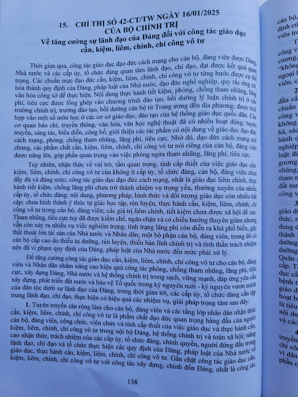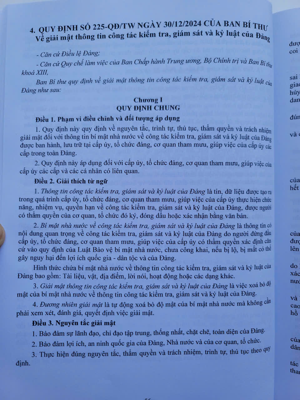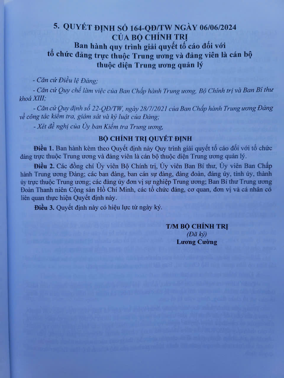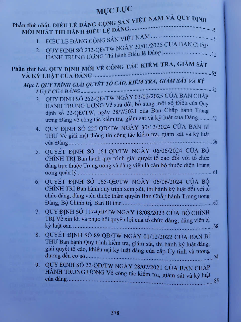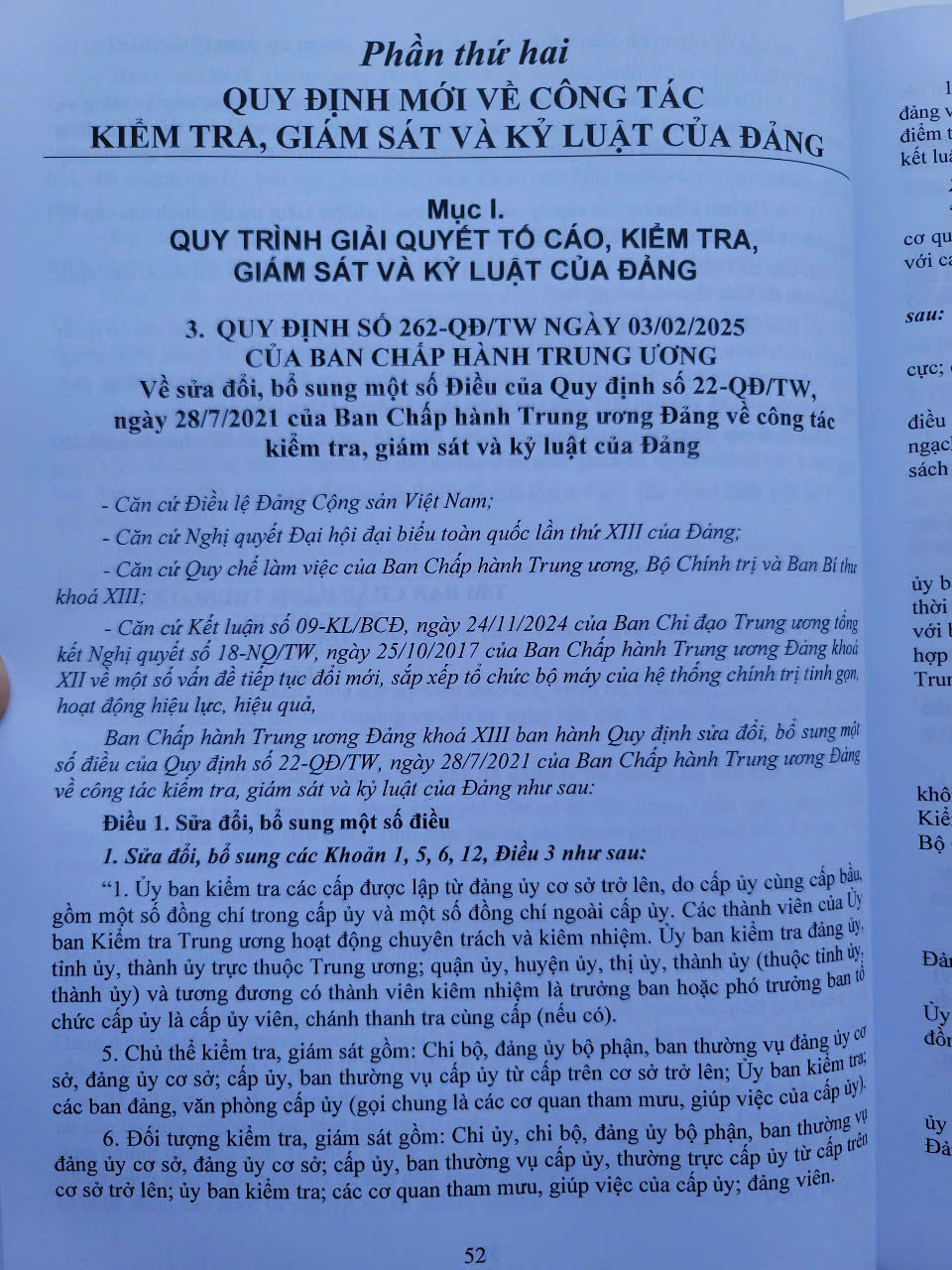 Thời gian qua, nhiều quy định, hướng dẫn của Ban Bí thư, Bộ Chính trị, Ban Chấp hành Trung ương cũng đã được ban hành như: Quy định số 231-QĐ/TW ngày 17/01/2025 Về bảo vệ người đấu tranh chống tham nhũng, lãng phí, tiêu cực, Quy định số 262-QĐ/TW ngày 03/02/2025 Về sửa đổi, bổ sung một số Điều của Quy định số 22-QĐ/TW, ngày 28/7/2021 của Ban Chấp hành Trung ương Đảng về công tác kiểm tra, giám sát và kỷ luật của Đảng…