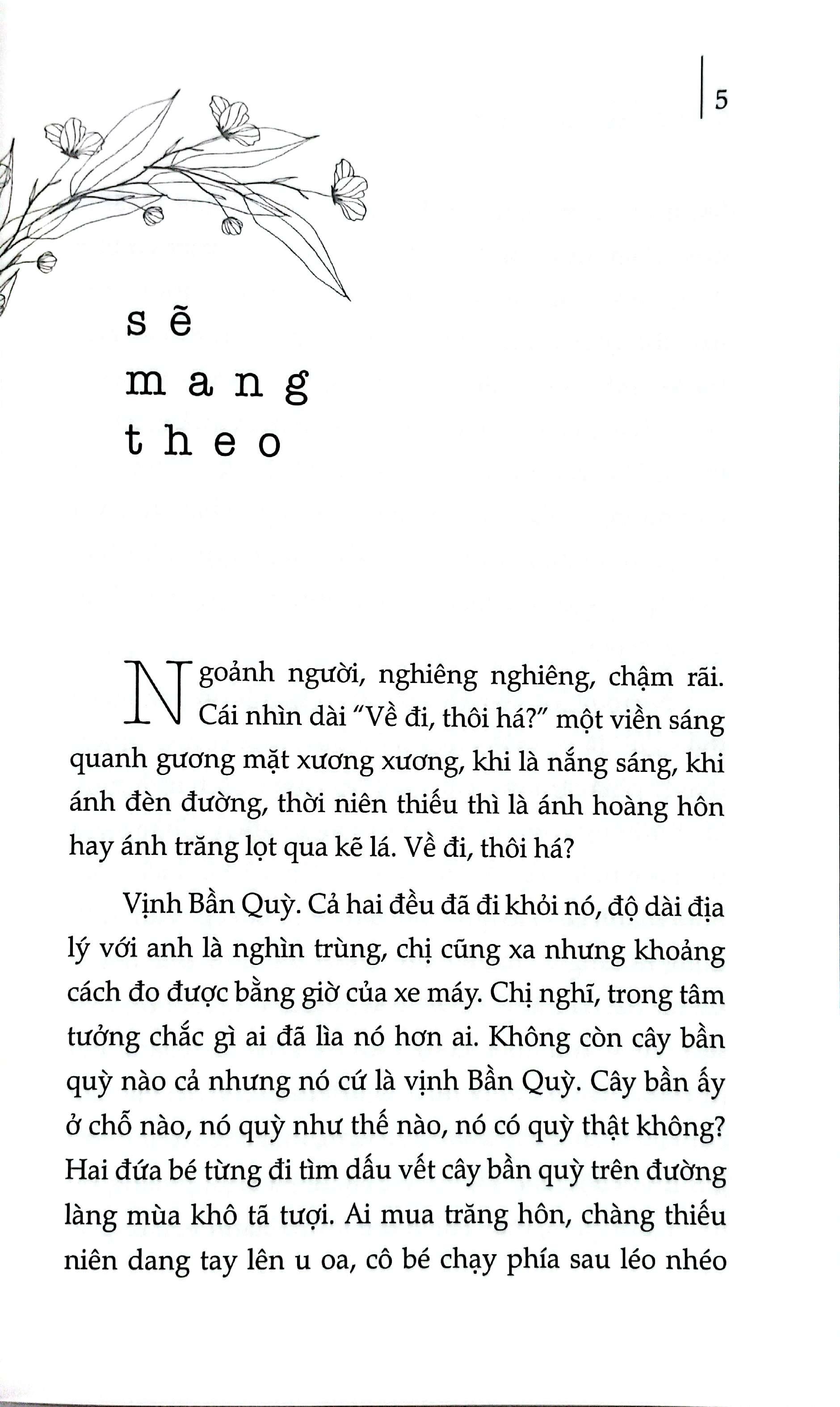 Đây là tinh tuyển với con số 21 trong tổng số hàng trăm truyện đã viết mấy chục năm qua. “Sẽ mang theo” là truyện viết 2020, cuối cùng, cái duyên thời gian ngẫu nhiên khi tôi đinh ninh sẽ không viết truyện ngắn nữa. Tôi mãn nguyện với việc chọn này và mời gọi bạn đọc và rằng, rằng nhất định tôi cũng sẽ mang theo – niềm vui nỗi buồn và vinh hạnh của một đời viết.” (Dạ Ngân)