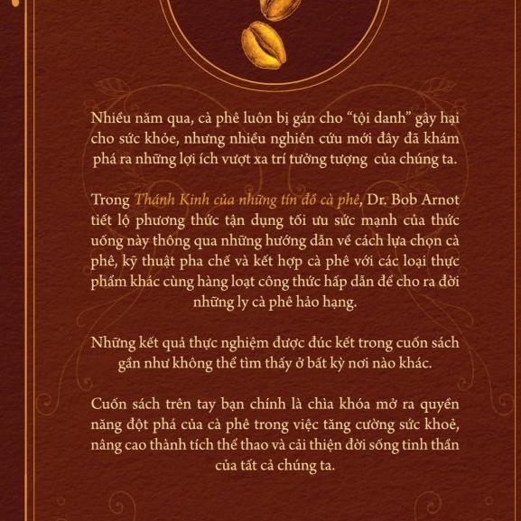 Mua tại TiktokCuốn sách hướng dẫn chúng ta cách lựa chọn những hạt cà phê chất lượng, một số kỹ thuật pha chế, các cách kết hợp cà phê với các loại thực phẩm được chọn lựa kỹ lưỡng, cũng như hàng loạt các công thức hấp dẫn. Ngoài ra, những hiểu lầm thường gặp nhất đối với cà phê cũng sẽ được tiết lộ cùng với cách tránh một số ít mối họa tiềm ẩn trong cà phê. Cuốn sách sẽ bật mí cho ta làm thế nào để gặt hái những lợi ích một cách an toàn, từ việc giảm một vài cân thừa đến cải thiện thành tích thể thao, và cả đẩy lùi bệnh tật.