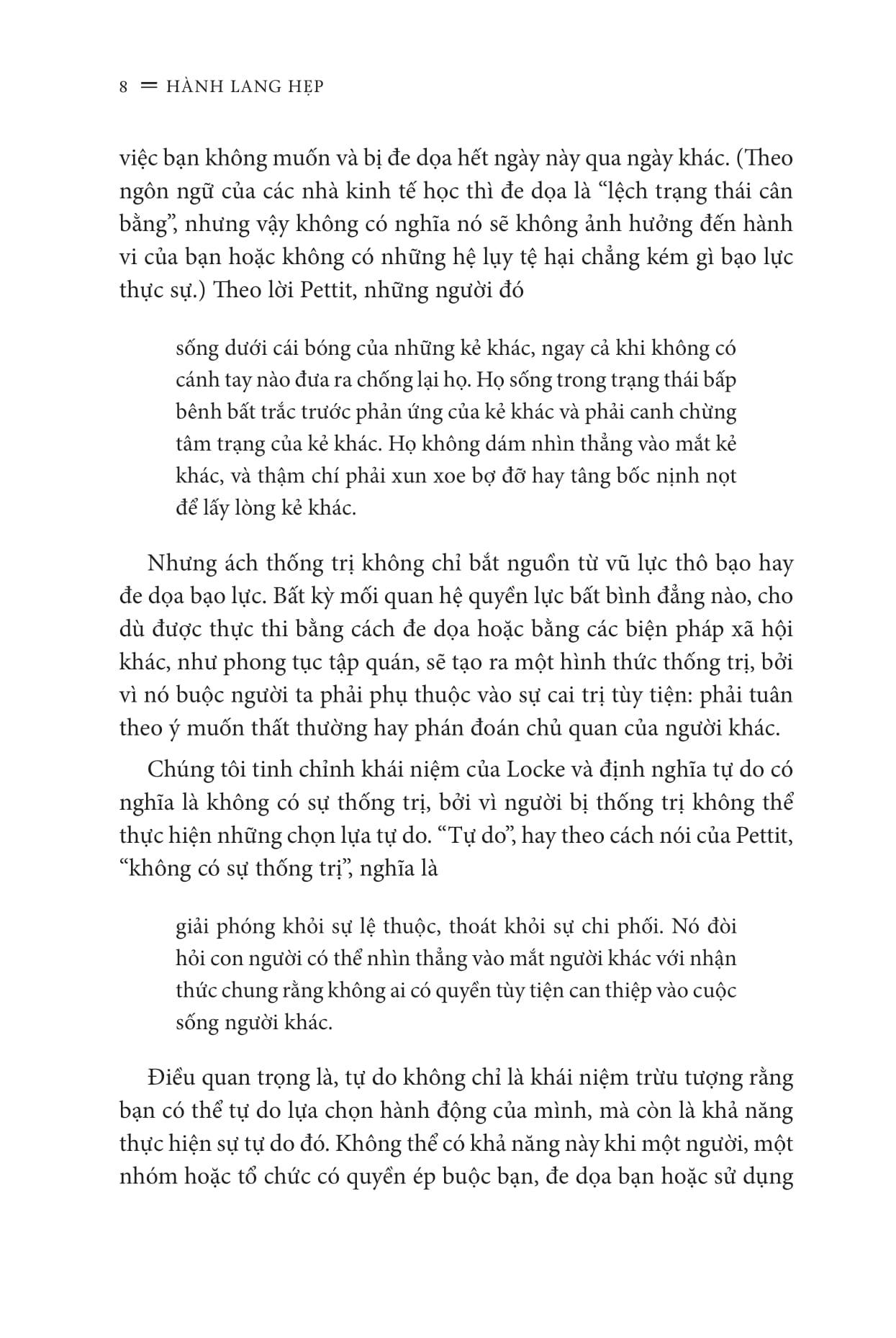 Tự do không hề là trật tự “tự nhiên” của vạn vật. Hầu như ở bất cứ nơi đâu vào bất kể thời nào, kẻ mạnh vẫn thống trị kẻ yếu, và tự do của con người bị tiêu tan trong bạo lực hoặc bởi phong tục tập quán lâu đời hay những chuẩn mực cứng nhắc. Nhà nước hoặc quá yếu không thể bảo vệ người dân thoát khỏi những mối đe dọa này, hoặc quá mạnh khiến người dân không thể tự bảo vệ m.ình trước sự chuyên quyền. Tự do chỉ xuất hiện trong thế cân bằng mong manh và bấp bênh giữa nhà nước và xã hội.