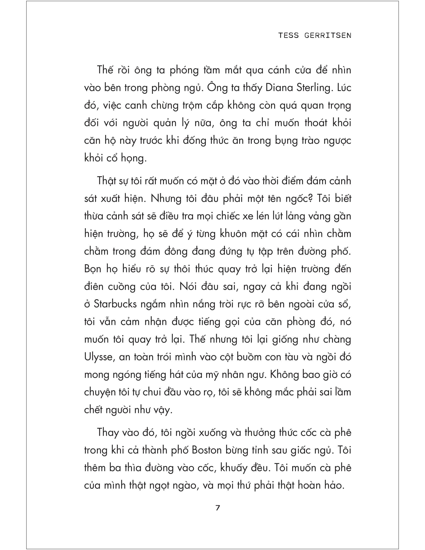 TESS GERRITSEN Là một bác sĩ chuyên nghiệp, Tess Gerritsen vốn mang trong m.ình tình yêu với những con chữ. Trong quá trình nghỉ thai sản, Tess đã viết truyện ngắn đầu tay của m.ình và giành giải nhất của một cuộc thi viết trên tạp chí Honolulu. Từ đó, bà quyết định theo đuổi đam mê viết lách.